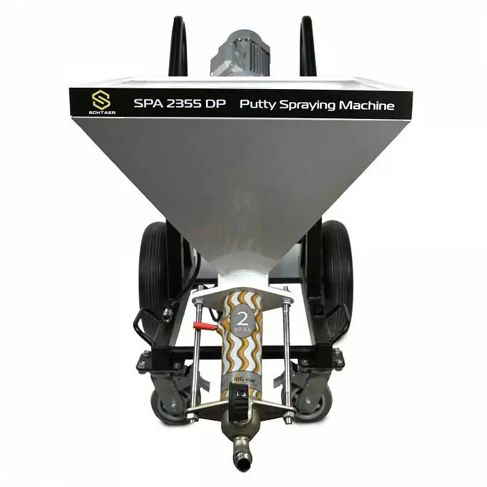 Schtaer SPA 2355 DP – аппарат для нанесения шпаклевки. Установка обеспечивает мягкое и равномерное покрытие с помощью плавной регулировки объема подаваемого материала. Материал покрытия подается из бака. Спиральный конвейер подает материал покрытия на эксцентриковый шнековый насос. При всасывании материал покрытия поступает в эксцентриковый шнековый насос. Этот насос создает давление, необходимое для транспортировки строительного раствора через шланг. Сжатый воздух, требуемый для атомизации, подается в распыляющую насадку. Установку для распыления строительного раствора можно включать и выключать с помощью электрического переключателя.
