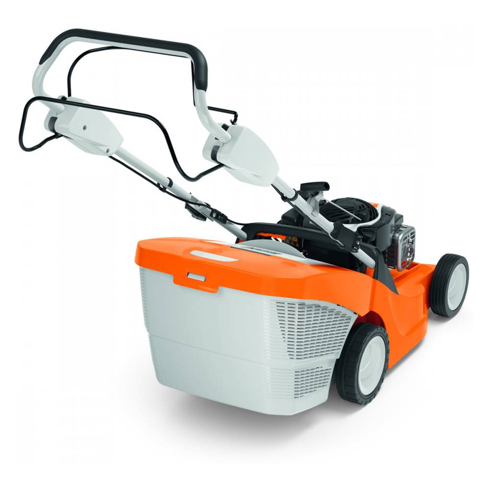 Бензиновая косилка STIHL RM 448 TX имеет ширину скашивания 46 см и привод на задние колёса. Она легко справляется с участками до 1200 м². Мощный поток воздуха перемещает скошенную траву в травосборник объемом 55 л. Высота скашивания имеет шесть ступеней регулировки в диапазоне 25-75 мм. Регулировка является центральной. Её легко выполнить благодаря подпружиненному механизму. Компактный и прочный корпус из полимера делает газонокосилку еще более надежной. Одноступенчатый привод колес делает работу еще легче.