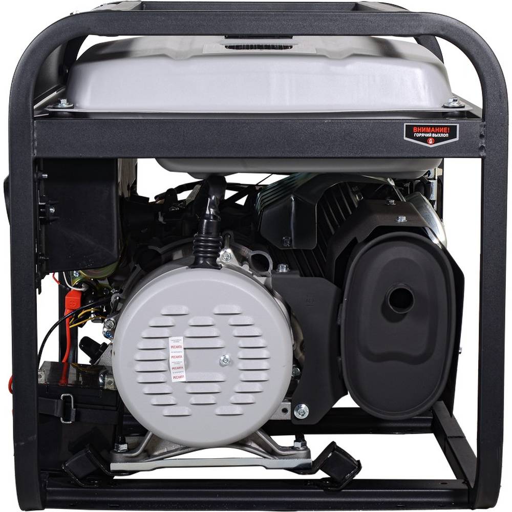 Номинальная мощность генератора составляет 5000 Вт с возможностью кратковременного увеличения до 5500 Вт, что позволяет одновременно подключать несколько электроприборов. Двигатель номинальной мощностью 13 л.с. сочетает высокую производительность с экономичностью, а вместительный топливный бак на 22 л обеспечивает продолжительную работу без дозаправки.