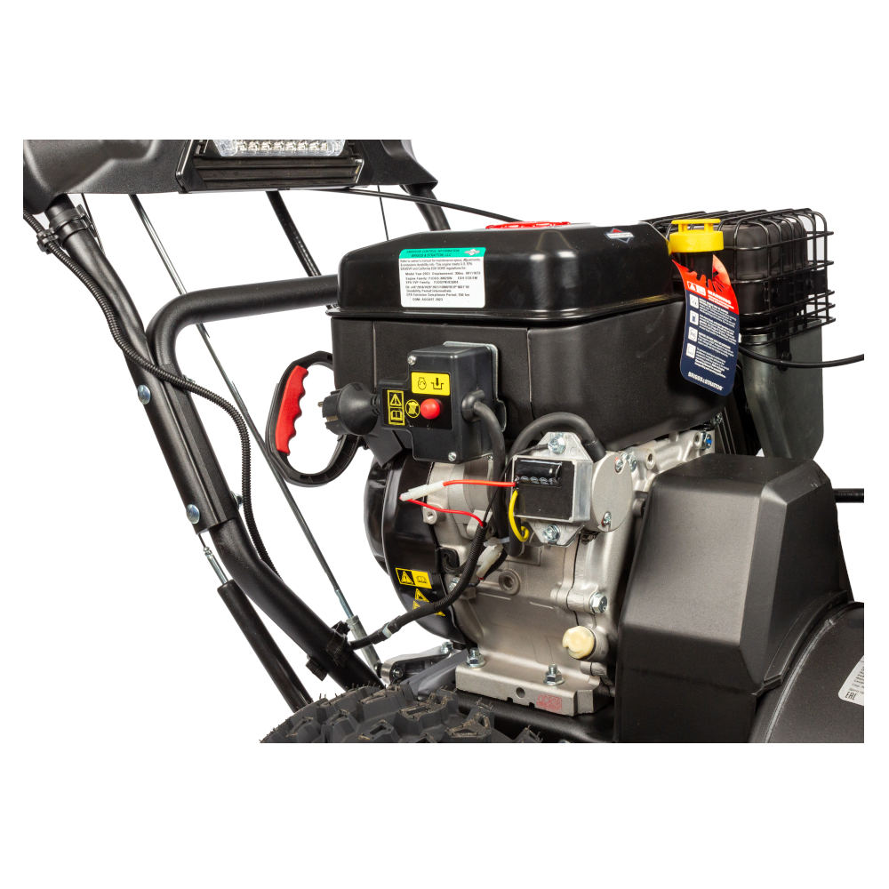 Оснащен двигателем B&S 1450 SNOW SERIES специальной зимней серии, который заводится при пониженных температурах и не требует ухода за воздушным фильтром ввиду его отсутствия. Благодаря мощному мотору снегоочиститель без затруднений за один проход освобождает от снега полосу шириной в 66см. Легко справляется с сугробами высотой до 54см. Запуск двигателя осуществляется электростартером, питающимся от электросети 220 вольт. Для облегчения маневрирования тяжелой машиной предусмотрена разблокировка колес, осуществляемая с панели управления. Шины на колесах имеют агрессивный и глубокий протектор для снижения возможной пробуксовки при уборке больших сугробов из слежавшегося или плотного снега.