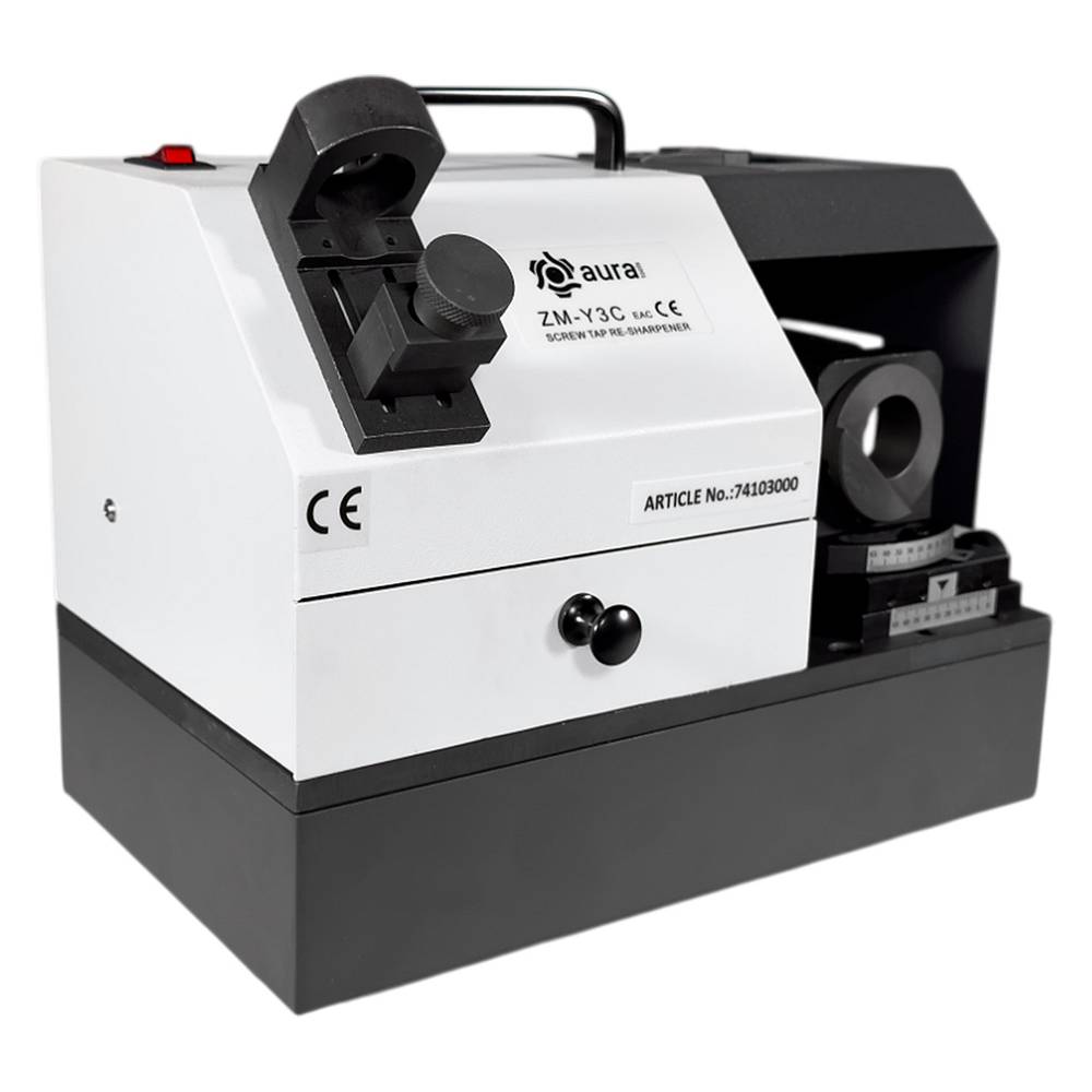 Cтанок для заточки метчиков AURA ZM-Y3C отличается простотой в эксплуатации, точностью и быстротой в использовании. Станок не требует высокой квалификации от пользователя. Заточка метчика занимает около 2-3 минут. Диск CBN для заточки метчиков из быстрорежущей стали входит в базовую комплектацию станка. Диск SDC для заточки твердосплавных метчиков предлагается как опция. Расчетная точность заточки 0,02 мм. Экономичный и мощный электрический двигатель, обеспечивает стабильную частоту вращения заточного диска. Двигатель рассчитан на длительный срок службы. Станок AURA ZM-Y3C позволяет произвести качественную заточку заходной части, торца и передних режущих кромок прямых метчиков, а так же заходной части и торца спиральных метчиков от М5 до М20 с 3 или 4-мя режущими кромками.