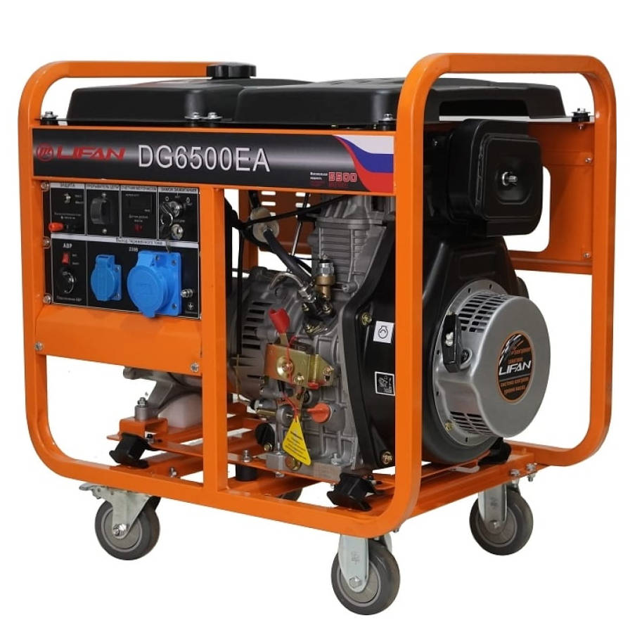 Дизельный генератор LIFAN DG6500EA используется в качестве аварийного источника бесперебойного питания. Генератор обладает мощностью в 5.5/5 кВт и способен работать непрерывно на протяжении почти 6 часов, благодаря чему данная модель является оптимальным решением, без проблем обеспечивающим питанием большое количество энергоемких электроприборов в течение длительного времени.