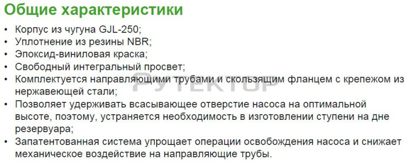 Донное соединительное устройство DAC с вертикальным напорным отверстием позволяет выполнять техническое обслуживание насоса без опорожнения резервуара, а также удерживает всасывающее отверстие насоса на оптимальной высоте. Корпус выполнен из чугуна, уплотнение из резины NBR.