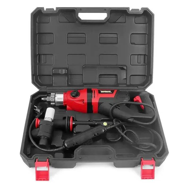 Дрель алмазного сверления MESSER DDM-150 (с микроударом) предназначена для алмазного бурения бетона, кирпича и камня, как с использованием стойки, так и для работы с рук. Для «ручной» работы инструмент имеет большую боковую рукоять, обеспечивающую надежный хват. Наличие двухскоростного редуктора позволяет выбрать оптимальную скорость бурения различных материалов алмазными коронками, а система регулируемой подачи воды в зону бурения не только облегчает сам процесс бурения, но и увеличивает срок службы алмазных коронок. Дрель оснащена системой с микроударом, что позволяет работать сухим сверлением без подачи воды. Поставляется в удобном для переноски и хранения пластиковом кейсе.