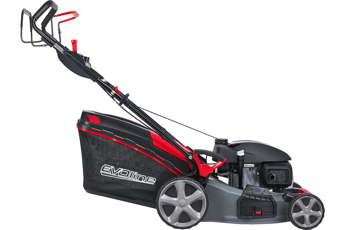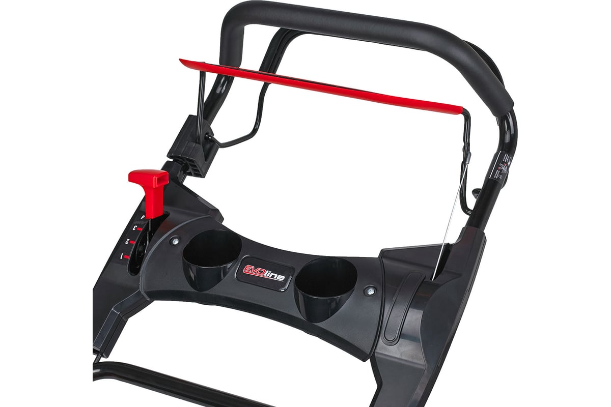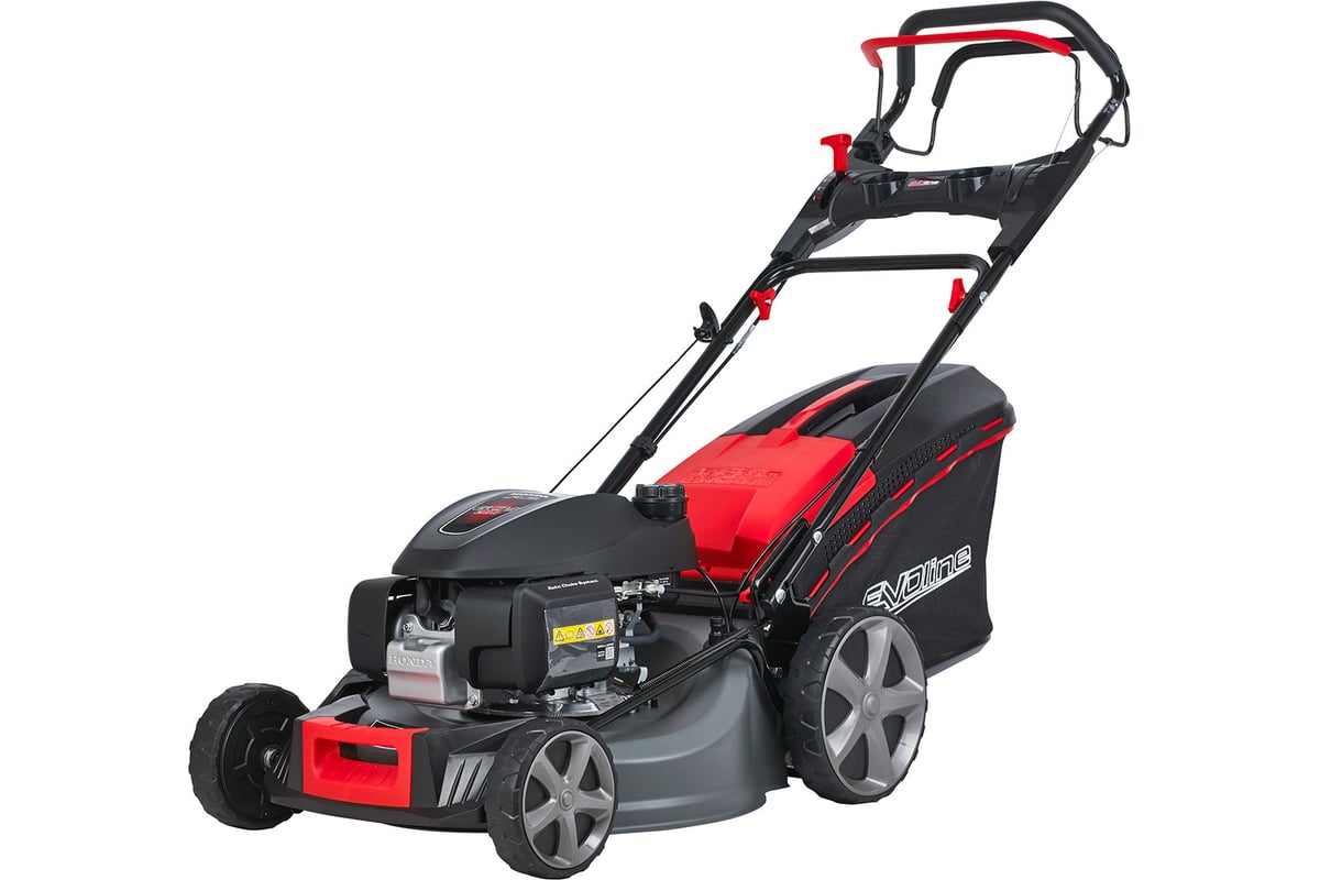 Бензиновая самоходная газонокосилка EVOline LMG 56 CVH серии PREMIUM позволяет получить идеально подстриженный газон и может использоваться как в частном, так и в коммунальном хозяйстве. Данная модель оснащена японским бензиновым двигателем Honda GCV 200 мощностью 5,6 л.с., с самыми выдающимися эксплуатационными характеристиками и высокой степенью производительности. Ширина скашивания составляет 56 см. В зависимости от поставленных задач, уровни высоты скашивания можно настраивать с помощью центральной регулировки высоты кошения. Долговечность эксплуатации газонокосилки обеспечивается прочной и надежной стальной декой с порошковым покрытием. Для комфортной работы на эргономичной складной рукоятке предусмотрено антивибрационное покрытие. Газонокосилка укомплектована вместительным комбинированный травосборник объёмом 70 л с индикатором заполнения. Специальная S-образная форма ножа обеспечивает мощный воздушный поток, который перед скашиванием «подтягивает» траву вверх. EVOline LMG 56 CVH оснащена трансмиссией с 4-мя скоростями и динамическим вариатором, благодаря чему пользователь (оператор) может выбрать удобную для него скорость передвижения. Газонокосилка легко передвигается на больших колёсах на двойных подшипниках. Наличие коннектора для подключения воды для очистки деки позволяет за считанные минуты промыть деку, не переворачивая газонокосилку. Для удобства использования, всё управление размещено перед пользователем на панели приборов с 2-мя подстаканниками.