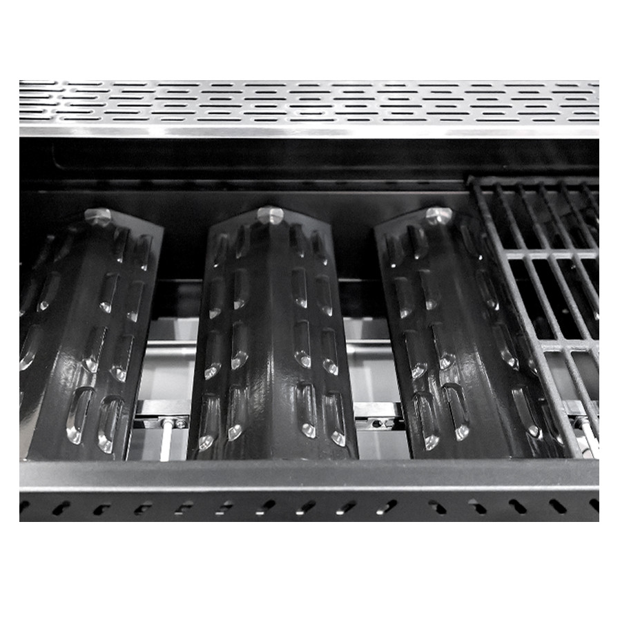 Оснащен тремя мощными горелками с рассекателями пламени, а также боковой конфоркой.