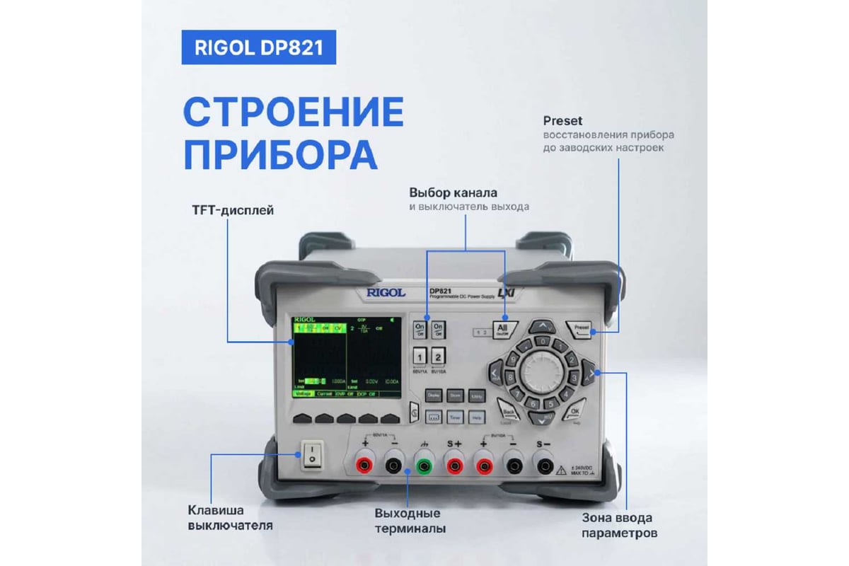 Программируемый источник питания Rigol DP821 демонстрирует отличные технические характеристики: низкий уровень шумов и пульсаций, высокую точность установки напряжения и тока. Уникальный инновационный графический интерфейс в источнике питания Rigol DP821 предлагает цифровую, аналоговую и графическую формы отображения параметров в реальном времени. Одной из ключевых особенностей является возможность мониторинга выходных параметров с последующим хранением данных для их дальнейшего анализа. Источник питания Rigol DP821 позволяет программировать выходные параметры, устанавливать задержку и условия синхронизации.