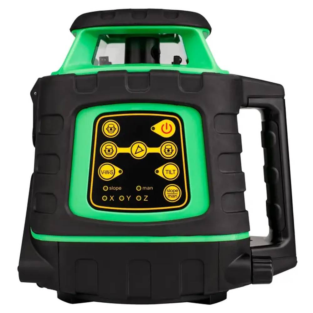 Ротационный лазерный нивелир AMO ROTOR 240G поставляется в расширенной комплектации. В комплект входит: устройство, приемник лазерного излучения, пульт ДУ, кронштейны для вертикальной и наклонной установки. Прибор проецирует горизонтальную плоскость разверткой на 360°, вертикальный луч и точку зенита. Модель оснащена мощным ярким лазером зеленого цвета, который отлично виден как в помещениях, так и на улице. Дальность действия с приёмником составляет 240 м. Лазерный уровень работает от шести батареек АА или Ni-MH-аккумуляторов.