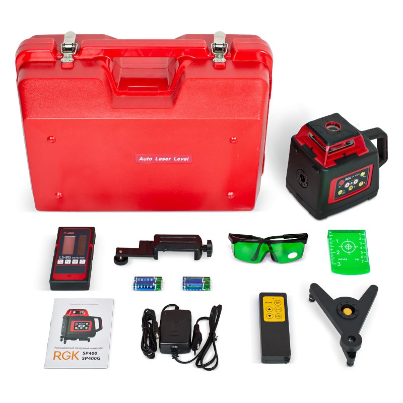 Прибор имеет два варианта исполнения: RGK SP-400 и SP-400G c красным и зеленым лучом соответственно. Лазерный уровень с лучом зеленого цвета в основном актуален при работе на больших расстояниях при необходимости визуального наблюдения луча.