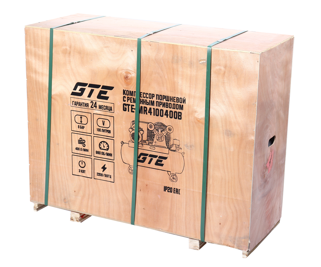 Компрессор поршневой GTE‑MR4100400B с ременным приводом — мощное решение для автосервиса, шиномонтажа и мастерской. Работает от стандартной сети 220 В, сочетает производительность 400 л/мин с ресивером на 100 л и обеспечивает давление до 8 атм. Мощность двигателя — 3,0 кВт.