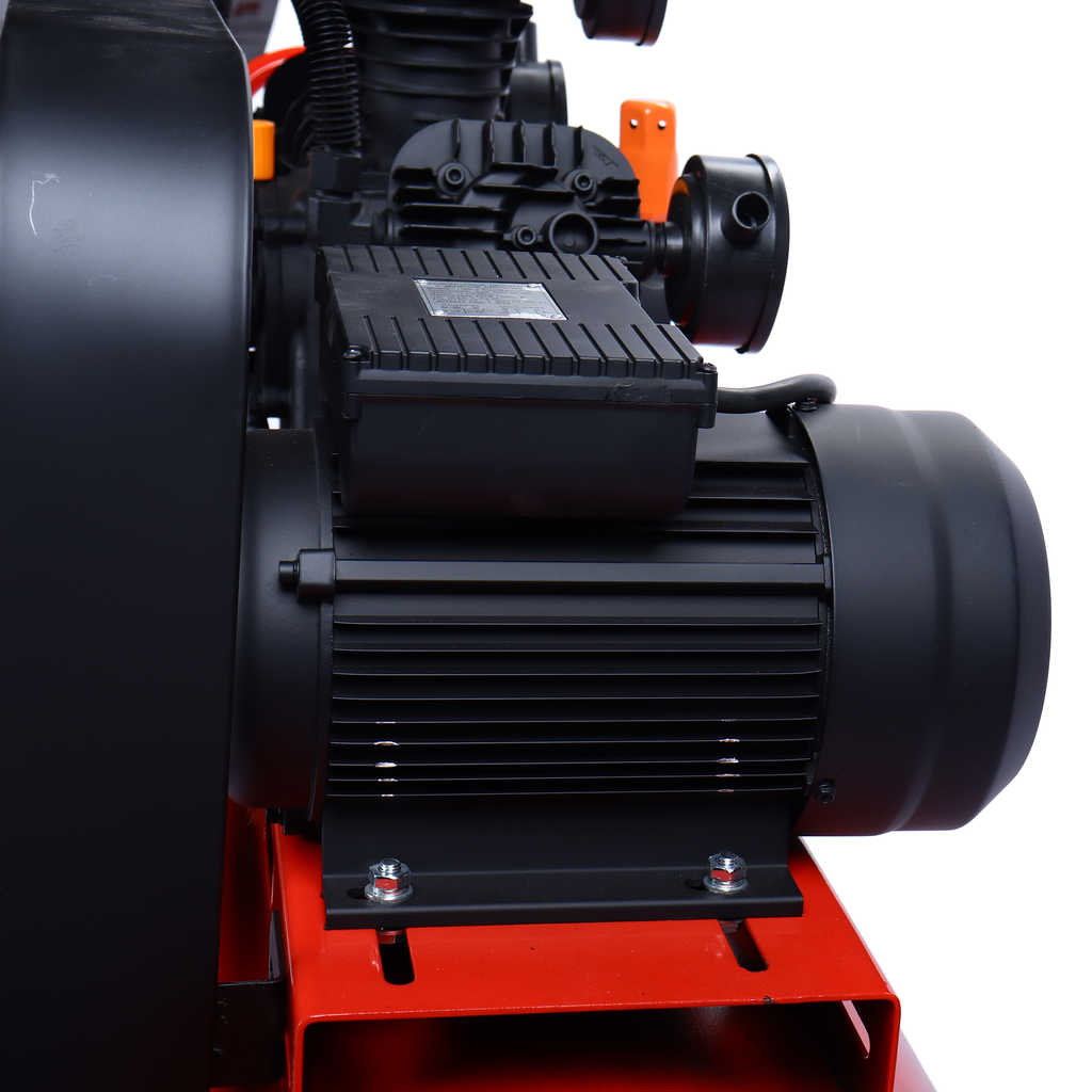 Вместительный ресивер на 200 л создаёт значительный запас сжатого воздуха, снижает частоту включений двигателя и сглаживает перепады давления. Ременной привод смягчает пусковые нагрузки, уменьшает вибрацию и продлевает ресурс агрегата. Трёхцилиндровая поршневая группа с масляной системой смазки гарантирует стабильную работу и эффективный теплоотвод даже при интенсивных нагрузках.