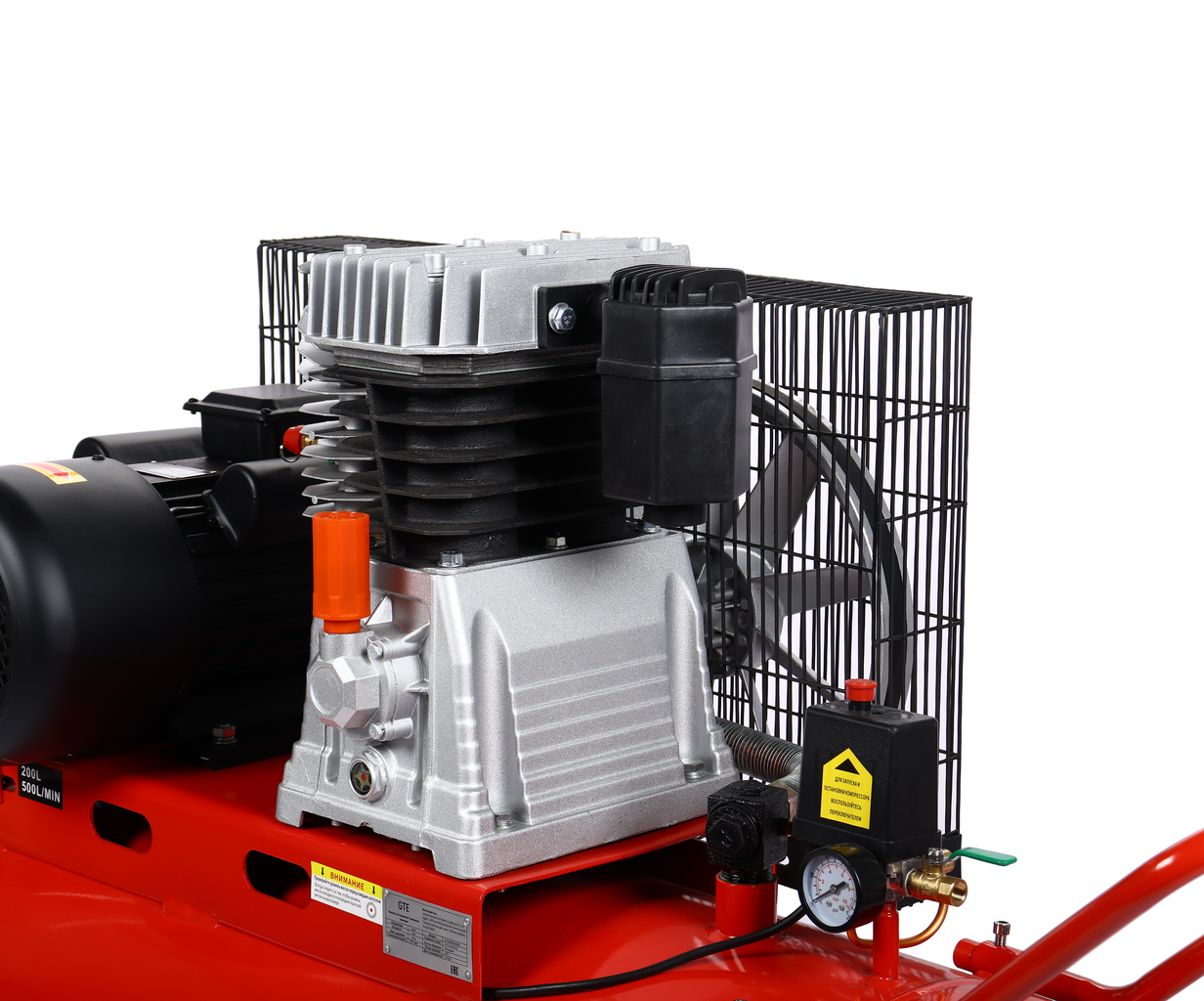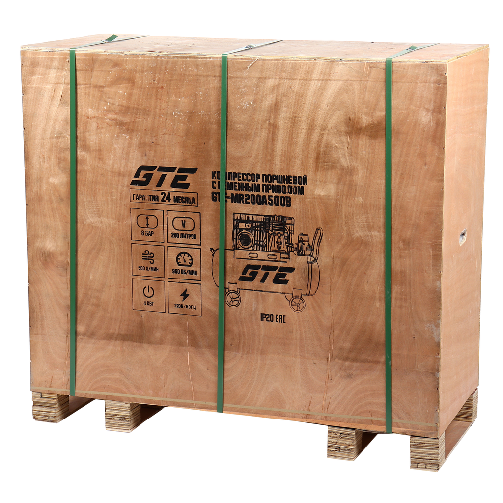 Поршневой компрессор GTE‑MR200A500B с ременным приводом — производительная модель для мастерских и небольших производств. Работает от сети 220 В, обеспечивает подачу воздуха до 500 л/мин при давлении 8 бар. Вместительный ресивер на 200 л позволяет поддерживать стабильное давление и снижает частоту включений двигателя.
