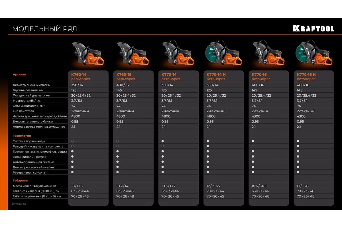 Бензорез KRAFTOOL K770-14 предназначен для выполнения резов в литом бетоне, камне, кирпиче, металлических конструкциях, стенах, асфальте и бордюрах. Универсальный бензорез оснащен одной из самых результативных центробежных систем очистки воздуха нового поколения, которая обеспечивает работу инструмента без замены фильтра в течение до одного года, а также встроенной автоматической системой компенсации загрязнения фильтра и высокоэффективной системой подавления вибраций, оснащается двигателем, который уменьшает выбросы на 50% и расход топлива максимум на 25%.