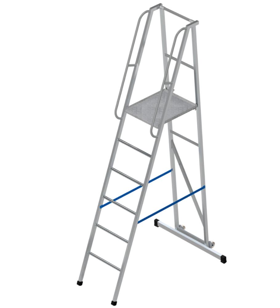 Лестница-платформа фиксированной высоты алюминиевая MEGAL ЛПФВА Н=1.0-5 передвижная с траверсой предназначена для работ на небольшом возвышении, при проведении ремонтных, отделочных и иных работ. Имеет безопасные ступени из специального рифленого профиля. Противоскользящая поверхность площадки из рифленого алюминиевого листа «квинтет», поручни и ограждение высотой 1,1м обеспечивают безопасный подъем, спуск и проведения работ. Площадка размером 600х500мм позволяет удобно расположиться рабочему с необходимым инструментом. Траверса в основании придает дополнительную устойчивость лестнице. Все соединительные узлы и элементы полностью безопасны, обработаны и одобрены службой контроля качества. Лестница имеет легкий вес за счет использования алюминиевых сплавов. Складная конструкция и наличие колес позволяют удобно эксплуатировать, транспортировать и хранить лестницу.