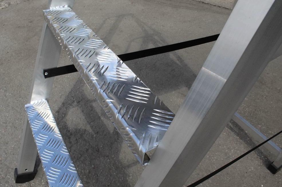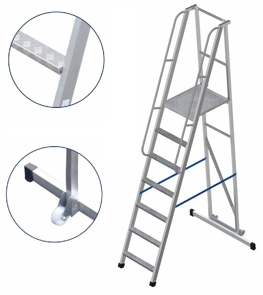 Лестница-платформа фиксированной высоты алюминиевая MEGAL ЛПФВА Н=1.5-8 пер. с трав. и шир. ступ. предназначена для работ на небольшом возвышении, при проведении ремонтных, отделочных и иных работ. Имеет безопасные широкие ступени из специального рифленого профиля. Противоскользящая поверхность площадки из рифленого алюминиевого листа, поручни и ограждение высотой 1,1м обеспечивают безопасный подъем, спуск и проведения работ. Площадка размером 600х500мм позволяет удобно расположиться рабочему с необходимым инструментом. Траверса в основании придает дополнительную устойчивость лестнице. Все соединительные узлы и элементы полностью безопасны, обработаны и одобрены службой контроля качества. Лестница имеет легкий вес за счет использования алюминиевых сплавов. Складная конструкция и наличие колес позволяют удобно эксплуатировать, транспортировать и хранить лестницу.