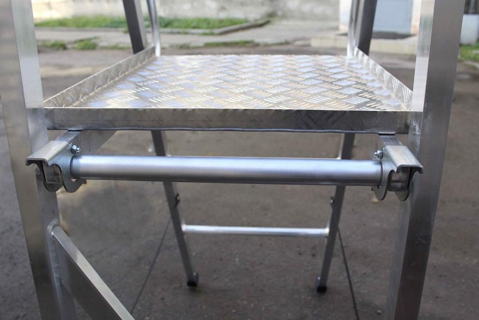 Лестница-платформа фиксированной высоты алюминиевая MEGAL ЛПФВА Н=2.0-8 пер. с трав. и шир. ступ. предназначена для работ на небольшом возвышении, при проведении ремонтных, отделочных и иных работ. Имеет безопасные широкие ступени из специального рифленого профиля. Противоскользящая поверхность площадки из рифленого алюминиевого листа, поручни и ограждение высотой 1,1м обеспечивают безопасный подъем, спуск и проведения работ. Площадка размером 600х500мм позволяет удобно расположиться рабочему с необходимым инструментом. Траверса в основании придает дополнительную устойчивость лестнице. Все соединительные узлы и элементы полностью безопасны, обработаны и одобрены службой контроля качества. Лестница имеет легкий вес за счет использования алюминиевых сплавов. Складная конструкция и наличие колес позволяют удобно эксплуатировать, транспортировать и хранить лестницу.