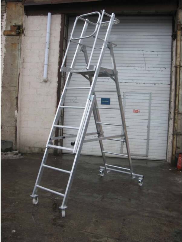 Лестница - платформа телескопическая MEGAL ТЛП-К (0,8 - 1,3) представляет собой безопасную и легкую конструкцию из алюминиевых профилей высокой прочности. Предназначена для работ в торговых залах, на складах, вдоль стеллажей и других объектов, при проведении ремонтных, монтажных и иных работ на возвышении. Лестница имеет легкий вес за счет использования алюминиевых сплавов. Лестница имеет регулируемый диапазон рабочих высот за счет изменения высоты рабочей площадки. Трехстороннее ограждение площадки со встроенной защитной планкой в районе колен, бортовое ограждение, ступени из рифленой трубы обеспечивают безопасный подъем, спуск и проведение работ. Заход на площадку закрывается калиткой. Площадка размером 680х510мм позволяет удобно расположиться рабочему с необходимым инструментом. Складная конструкция позволяет осуществлять простую и быструю сборку. Небольшая занимаемая площадь и прочные поворотные колеса со стопорами позволяют легко маневрировать в ограниченном пространстве.