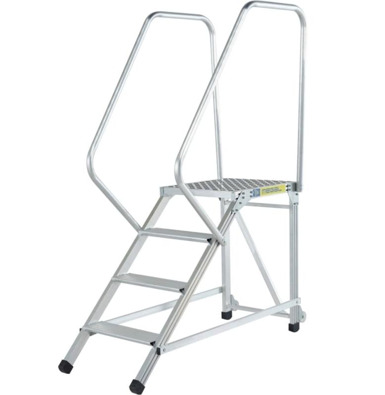 Лестница подмости MEGAL ЛП-0,6 с двумя поручнями используется при выполнении монтажных, сервисных и других работ на небольших высотах. Широкие ступени глубиной 160 мм из специального рифленого профиля для безопасности подъема и комфорта в работе. Верхняя площадка размером - 0,600х0,675 м. Наклонный лестничный марш под углом 45 градусов. Для удобства подъема подмости оснащены двумя поручнями. Высокая грузоподъемность обеспечивается за счет использования труб и профилей со стенкой не менее 2,5мм. Ножки подмостей имеют резиновые противоскользящие башмаки. Для удобства перемещения подмости оснащены колесами.