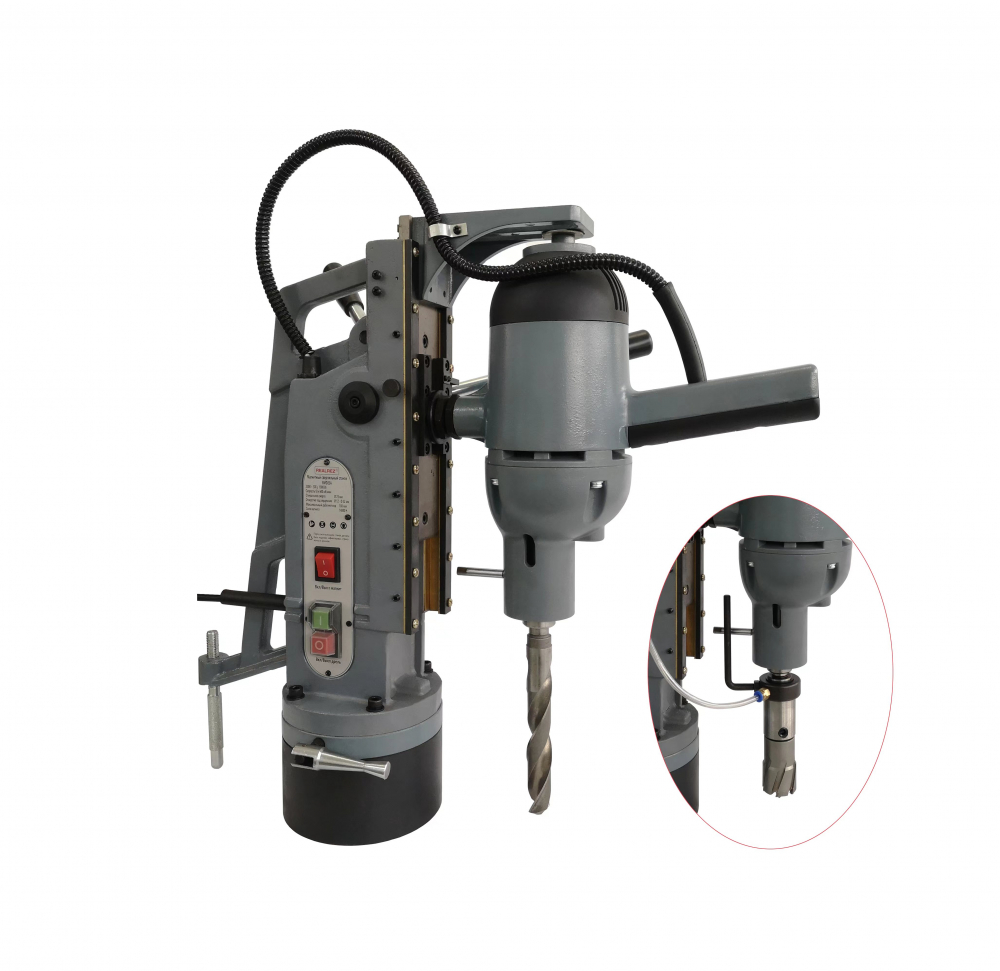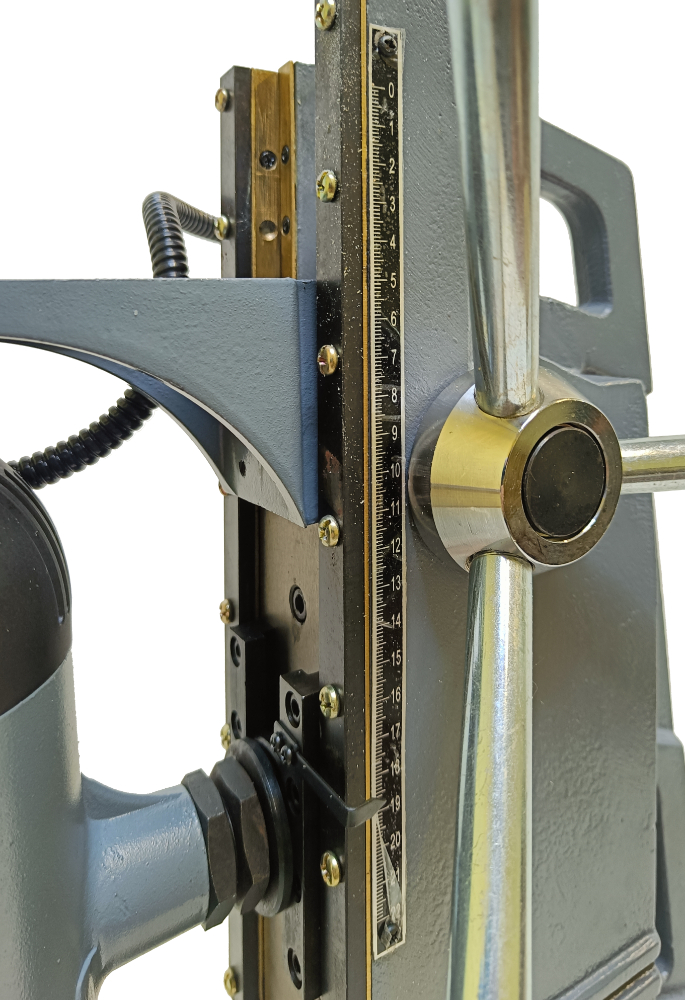 Это станок с подвижным магнитным основанием, то есть при активированном электромагните возможно разъединить жесткую связь станины с магнитом и отрегулировать положение центра сверла, потом снова жестко закрепить станок поворотом рукоятки.