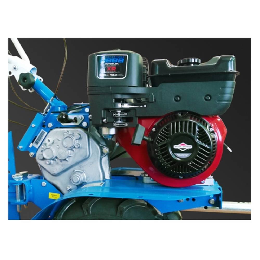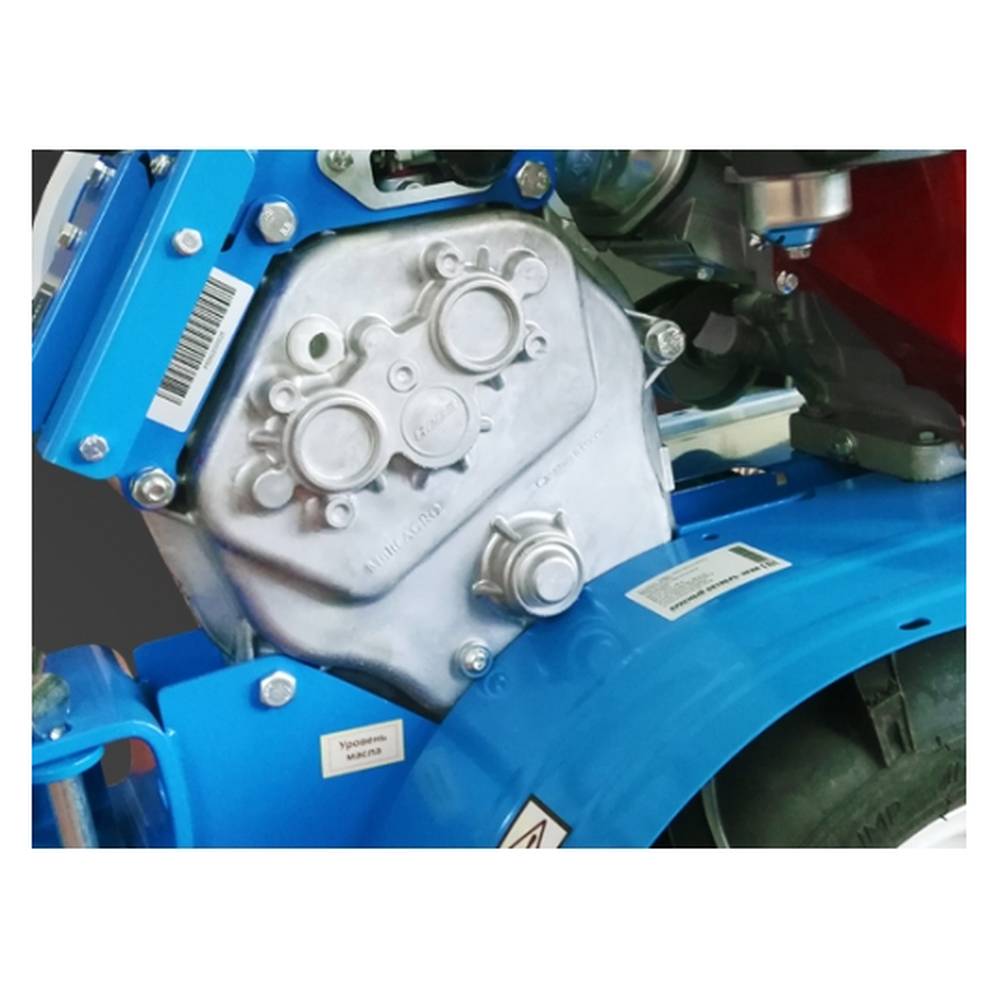 Мотоблок оснащен двигателем MX175 мощностью 6 л.с. Топливный бак объемом 3,9 л позволяет работать долгое время без дозаправки. Шестеренчато-цепной редуктор с механической передачей обеспечивает движение на 4 скоростях вперед и 2 назад, позволяя работать в разных условиях.