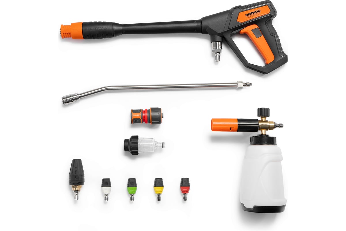 DAEWOO DAW 950W INDUSTRIAL — промышленная мойка высокого давления от корейского производителя DAEWOO. Модель предназначена для очистки различных поверхностей, например, автомобиля, фасада дома, садового инвентаря или террасы. 5-поршневая помпа DAEWOO VRX с пятью поршнями вместо трёх, поршни работают в масляной ванне, что снижает нагрузку на поршни и увеличивает производительность и ресурс мойки. Профессиональный индукционный двигатель по технологии BRUSHLESS с высоким ресурсом, низким уровнем шума, повышенной мощностью и компактными размерами.