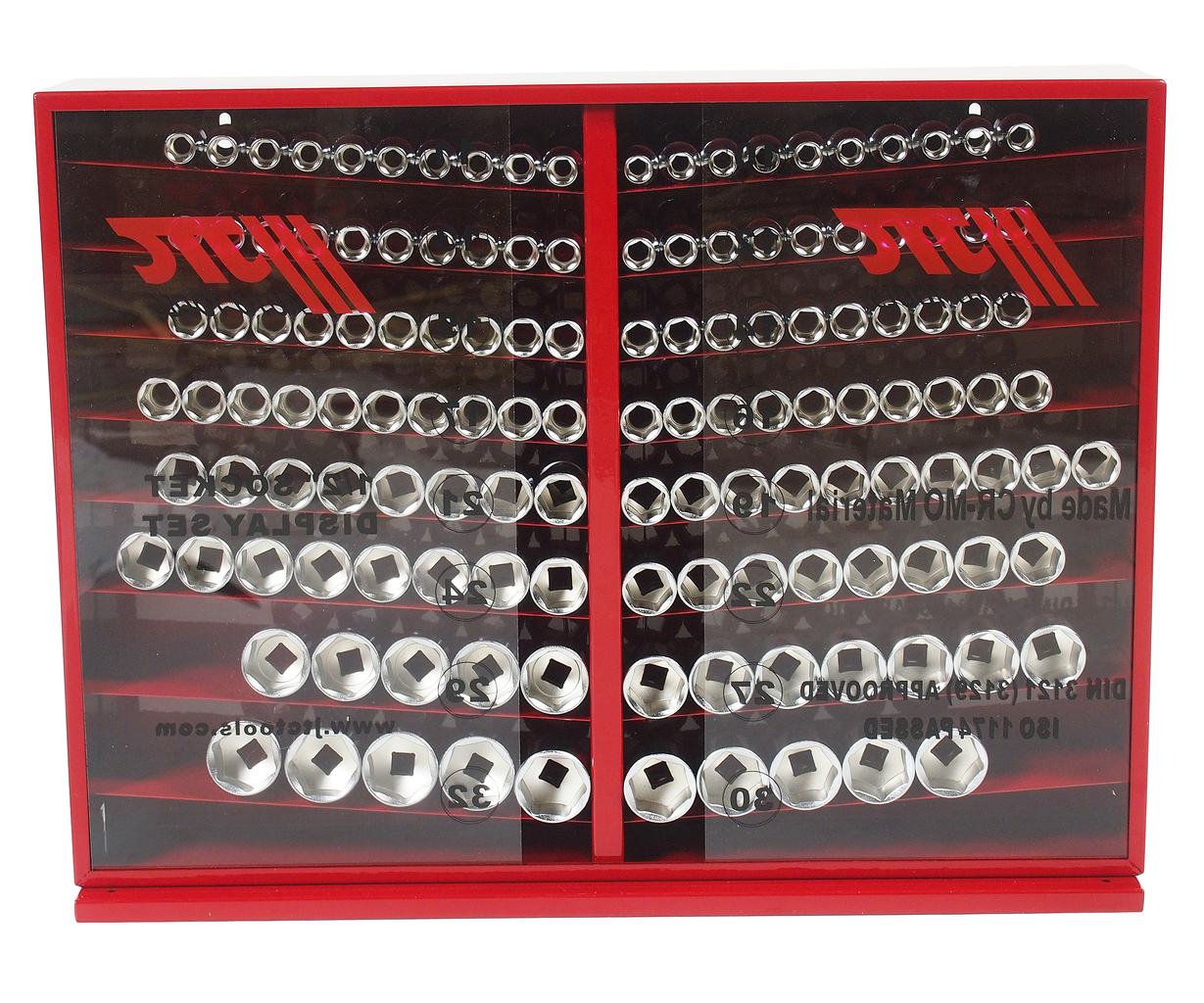 Набор торцевых головок JTC-H4137 - профессиональный набор торцевых головок в металлическом шкафу для работы с шестигранным крепежом размером от 10 до 32 мм. Предназначен для автосервисов, СТО и мастерских.