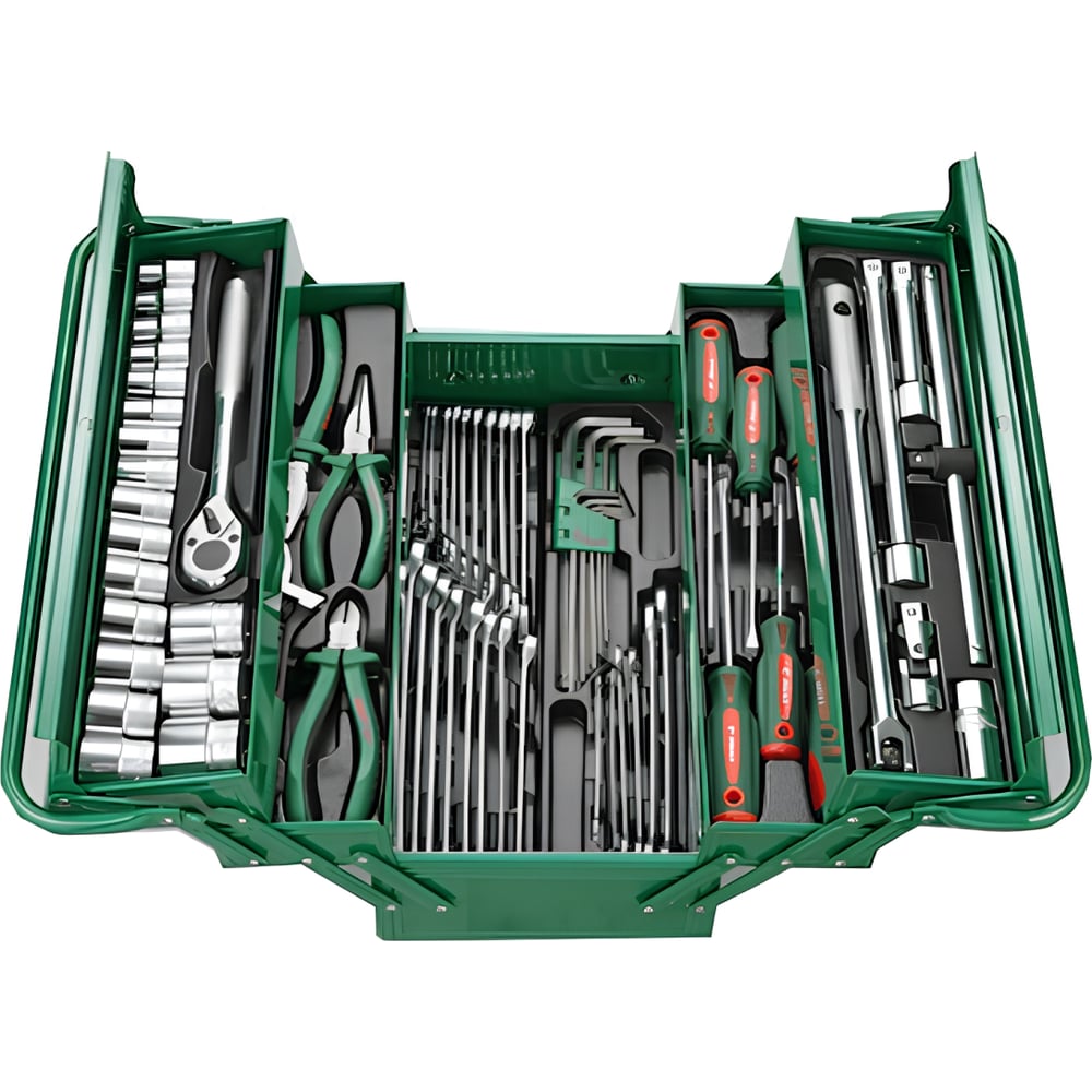 Ящик с набором инструмента Hans 68 предметов TTBK-68G обладает большим количеством приспособлением для обслуживания и ремонта. Комплект поставляется в металлическом ящике с несколькими отсеками для удобного размещения инструментов. Рабочие части изготовлены из высокопрочной стали. Рукоятки выполнены из двухкомпонентного материала и пластика.