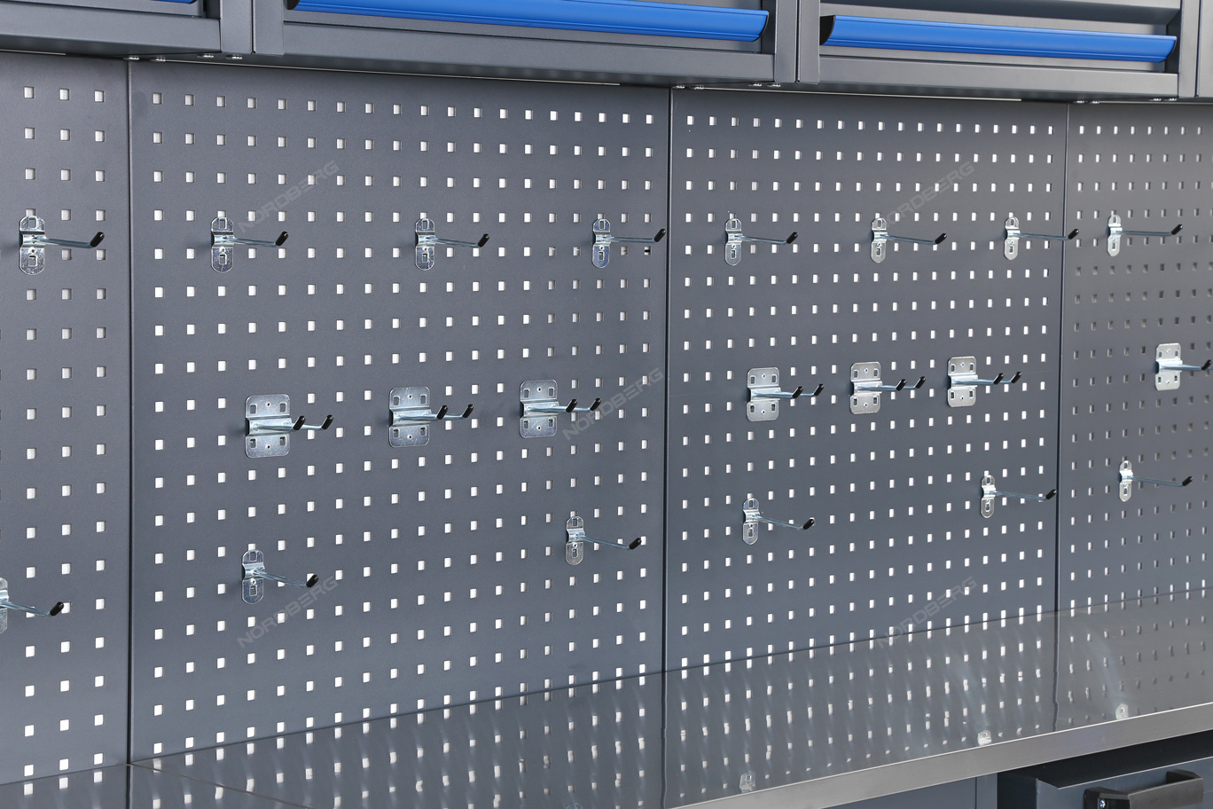 Разнообразие модулей: включая шкафы с 8 и 5 ящиками, тележку и перфорированные панели, система адаптируется под разные типы задач;