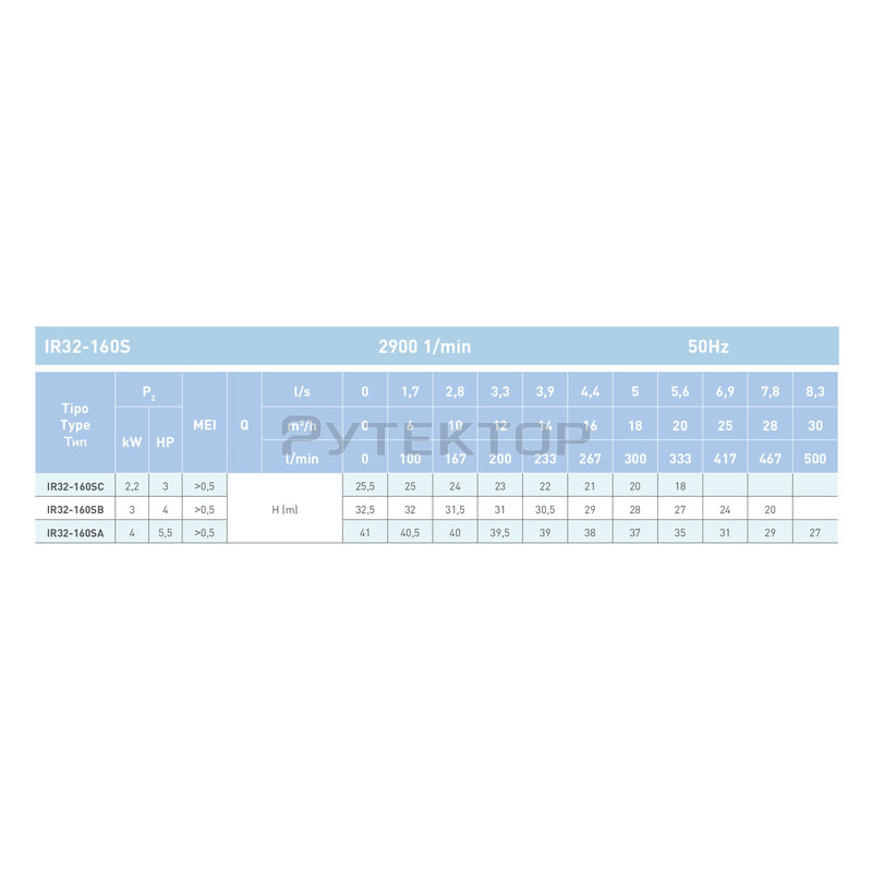 Консольно-моноблочные электронасосы с осевым всасыванием с корпусом насоса выполненным согласно стандарту EN733. Насосы и двигатели соответствуют директиве 2009/125 /CE (ErP). Применение Насосы предназначены для перекачивания чистых жидкостей, не содержащих абразивных примесей и не агрессивных для материалов из которых изготовлен насос, в системах водоснабжения, кондиционирования, циркуляции и теплоснабжения, в бытовой и промышленной сферах, в системах пожаротушения. Рабочие характеристики Параметры насоса с двигателем ~ 2900 об / мин. Максимальная производительность: 280 м3 / ч Максимальный напор: 129 м Параметры насоса с двигателем ~ 1450 об / мин. Максимальная производительность: 450 м3 / ч Максимальный напор: 42 м