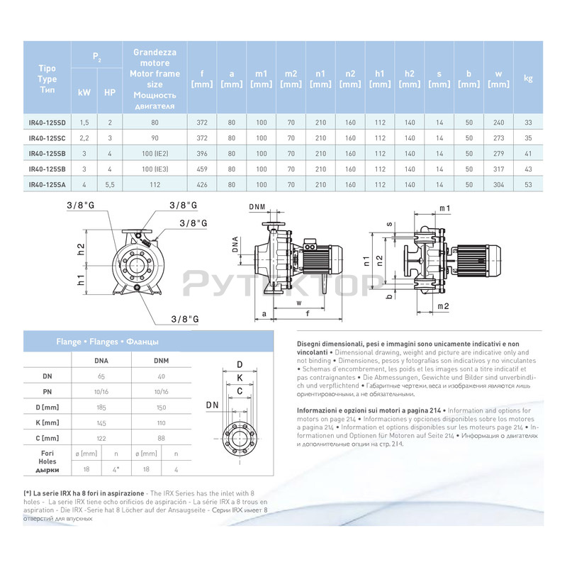 Консольно-моноблочные электронасосы с осевым всасыванием с корпусом насоса выполненным согласно стандарту EN733. Насосы и двигатели соответствуют директиве 2009/125 /CE (ErP). Применение Насосы предназначены для перекачивания чистых жидкостей, не содержащих абразивных примесей и не агрессивных для материалов из которых изготовлен насос, в системах водоснабжения, кондиционирования, циркуляции и теплоснабжения, в бытовой и промышленной сферах, в системах пожаротушения. Рабочие характеристики Параметры насоса с двигателем ~ 2900 об / мин. Максимальная производительность: 280 м3 / ч Максимальный напор: 129 м Параметры насоса с двигателем ~ 1450 об / мин. Максимальная производительность: 450 м3 / ч Максимальный напор: 42 м
