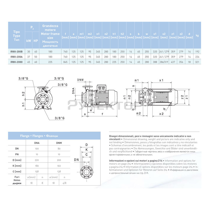 Консольно-моноблочные электронасосы с осевым всасыванием с корпусом насоса выполненным согласно стандарту EN733. Насосы и двигатели соответствуют директиве 2009/125 /CE (ErP). Применение Насосы предназначены для перекачивания чистых жидкостей, не содержащих абразивных примесей и не агрессивных для материалов из которых изготовлен насос, в системах водоснабжения, кондиционирования, циркуляции и теплоснабжения, в бытовой и промышленной сферах, в системах пожаротушения. Рабочие характеристики Параметры насоса с двигателем ~ 2900 об / мин. Максимальная производительность: 280 м3 / ч Максимальный напор: 129 м Параметры насоса с двигателем ~ 1450 об / мин. Максимальная производительность: 450 м3 / ч Максимальный напор: 42 м
