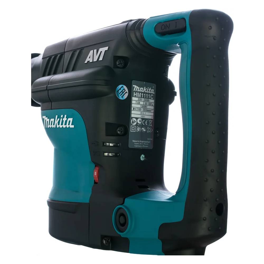 Отбойный молоток Makita HM1111C - высокопроизводительный ударный перфоратор с эффективной системой гашения вибрации AVT, создан для выполнения сложных рабочих задач и интенсивной нагрузки. Оснащен единственным режимом долбление. Модель с мощным двигателем потребляющим до 1300 Вт. Интенсивность долбления от 1100 до 2660 уд/мин. Сила удара составляет 17,2 Дж. Оснастка удерживается патроном SDS max. Агрегат с индикацией состояния угольных щеток. Есть функция плавного пуска, которая обеспечивает постепенный набор оборотов, предохраняет от рывков оснастки в начале рабочего процесса, а также защищает электросеть и механизмы перфоратора. Вес инструмента 8 кг. Длина сетевого шнура 5 м. Частоту вращения можно регулировать. Есть боковая рукоять для удобного и крепкого удержания при длительных нагрузках. Долото можно устанавливать в любом из двенадцати положений. Инструмент поставляется в кейсе для хранения и транспортировки.