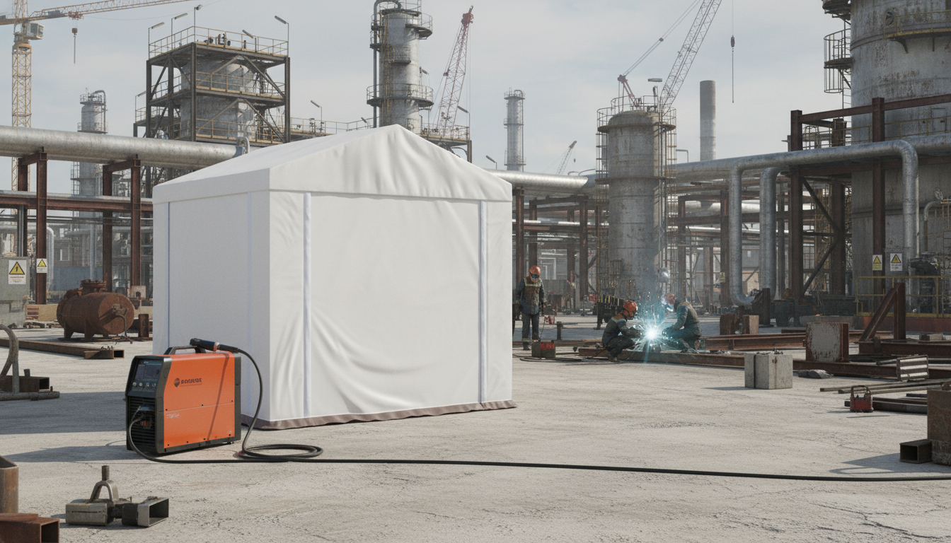 Палатка сварщика 3x3 метра предназначена для укрытия участков трубопровода при проведении изоляционных, монтажных и сварочных работ. Она защищает рабочее место от дождя, ветра, снега и перепадов температур, создавая комфортные условия для выполнения работ.