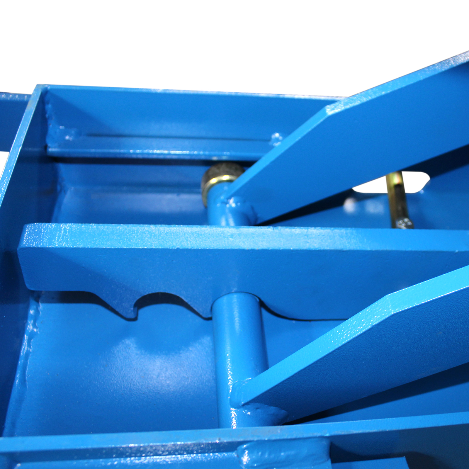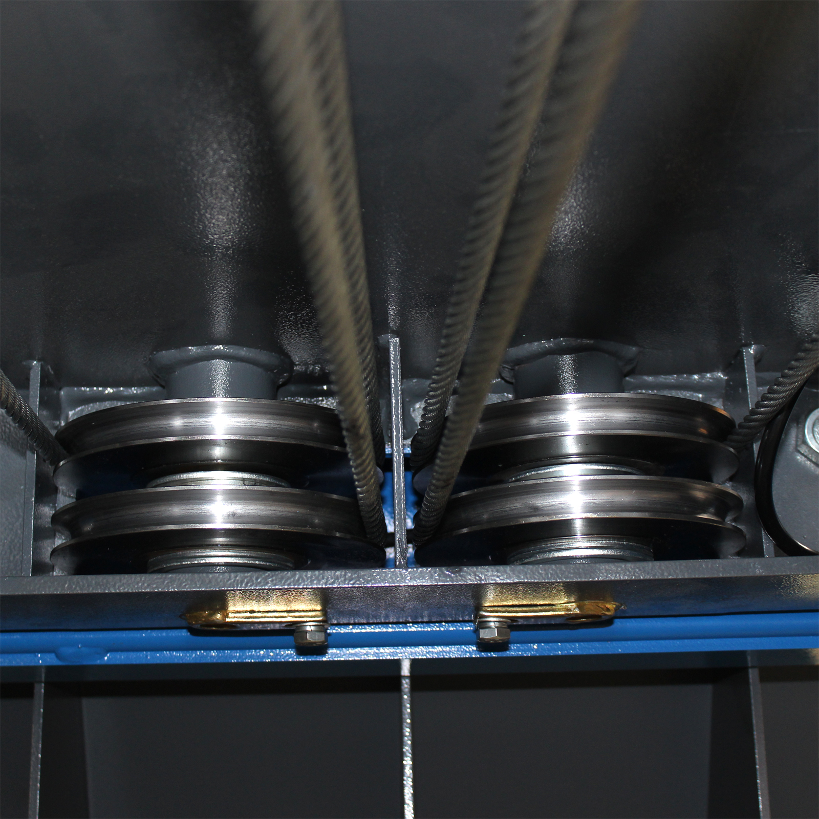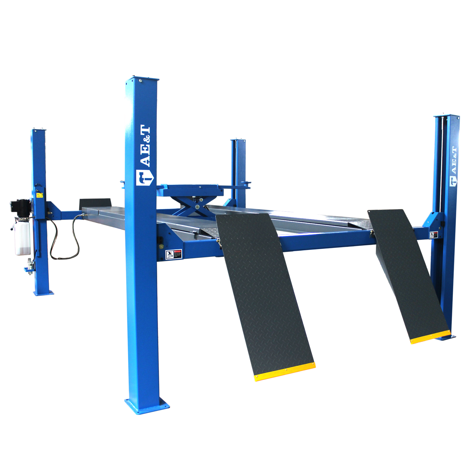 Оборудование приводится в действие гидравлическими цилиндрами и системой стальных тросов, что дает невысокий уровень шума. Данная модификация включает набор скользящих пластин и поворотных дисков, а также траверсу для реализации работ по развалу-схождению колес.