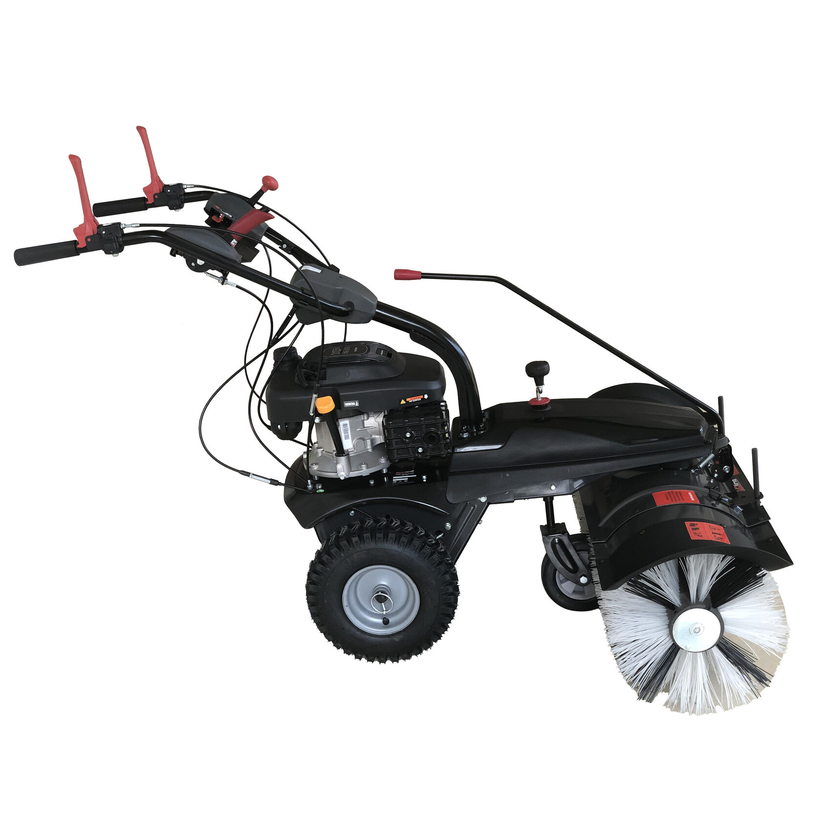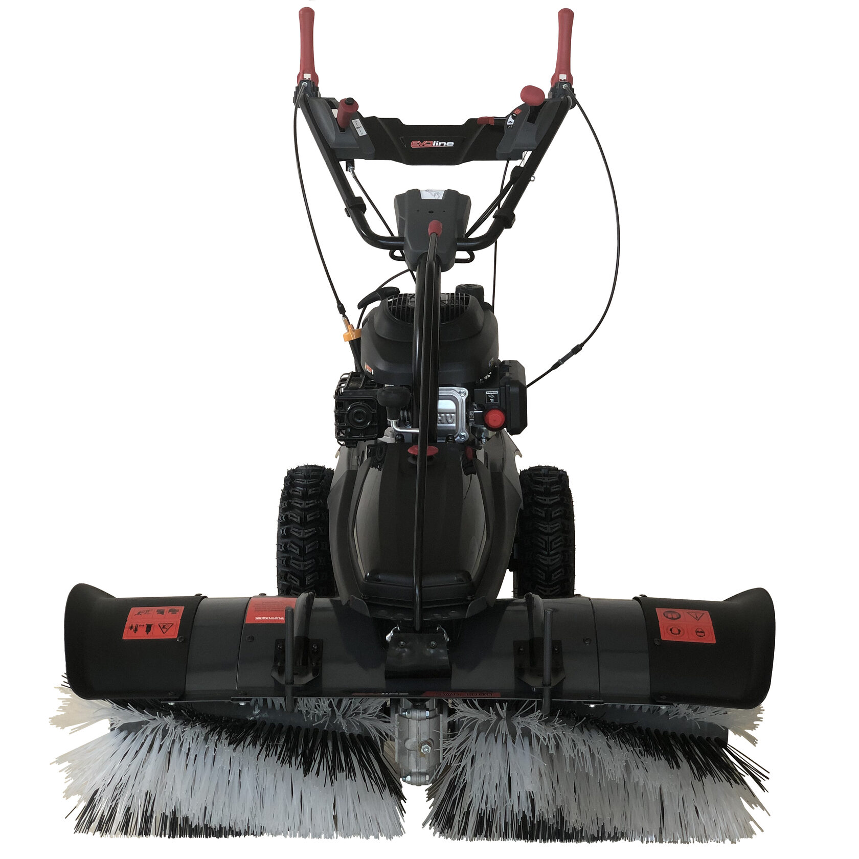 Максимальную производительность обеспечивает бензиновый двигатель Zongshen мощностью 6,5 л.с., который запускается с помощью ручного стартера. Щетки устанавливаются на подметальную машину EVOline SWG 1000 очень быстро без применения дополнительных инструментов, рабочая ширина составляет 100 см. Крупные колеса с протекторным рисунком способствуют легкому продвижению машины по разным типам местности.