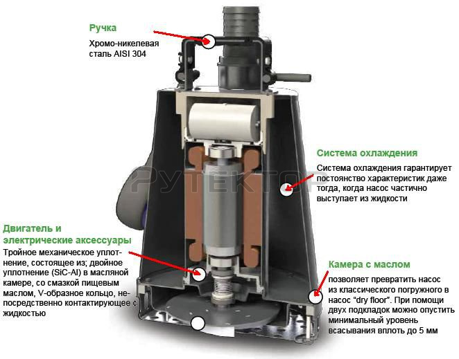 Насосные агрегаты типа DR-Steel - погружные с вертикальным подающим патрубком. Проточная часть насоса, рабочие колеса выполнены из нержавеющей стали; имеют водяное охлаждение двигателя. Назначение: для слегка загрязненной воды из прудов, колодцев и ручьев с взвешенными частицами с диаметром до 12 мм и температурой воды не более 40° С. Кратковременно до 90° С (максимум на 3 мин.)