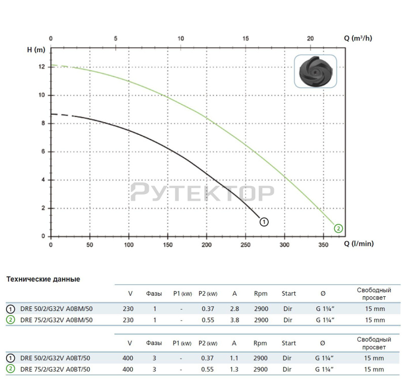 Насосные агрегаты типа DRE - погружные с открытым многоканальным рабочим колесом и вертикальным подающим патрубком. Проточная часть насоса и рабочее колесо выполнены из чугуна. Одно механическое уплотнение из карбида кремния и сальник. Электродвигатель сухого типа.
