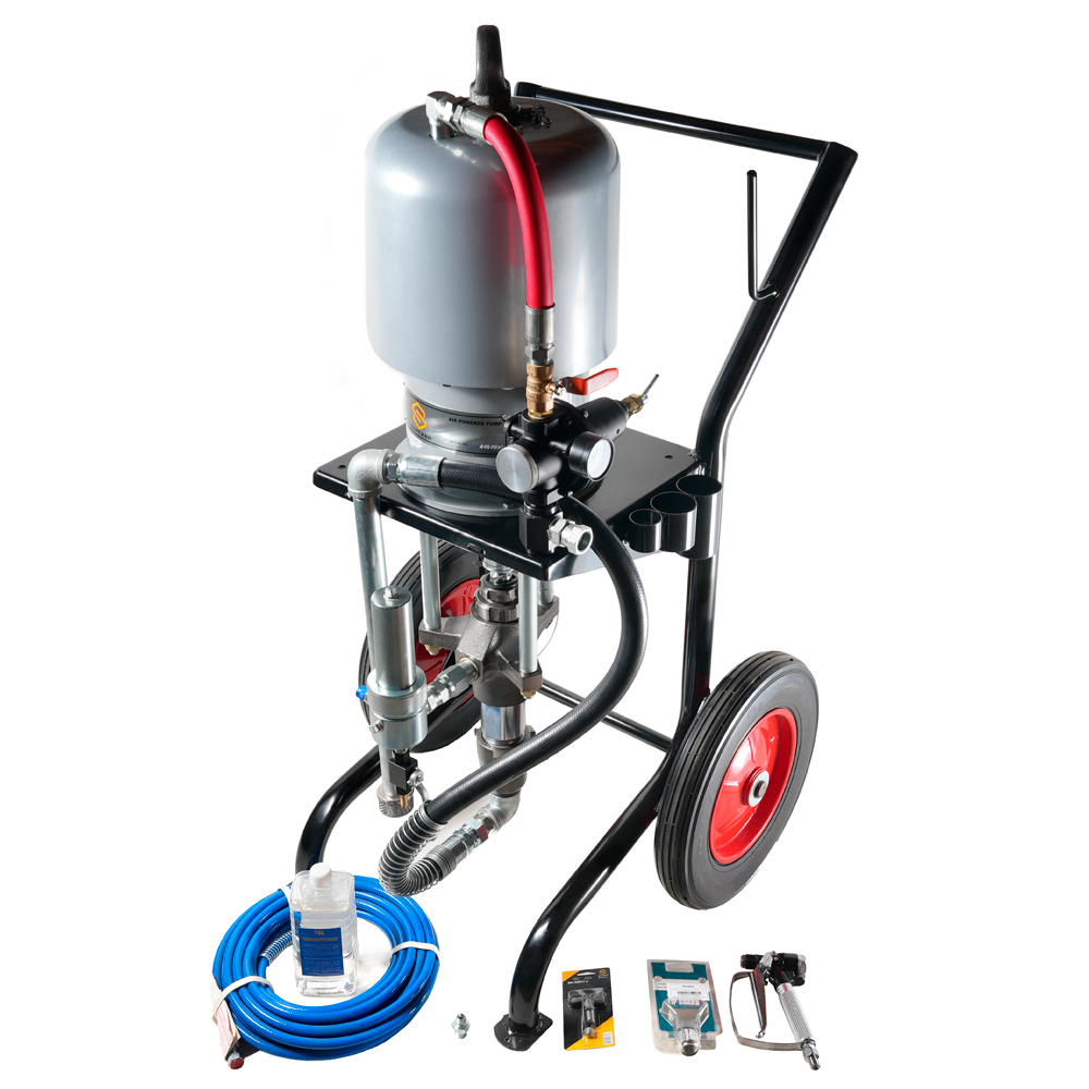 В окрасочный агрегат поступает воздух от компрессора или пневматической сети, (для покраски аппаратом требуется от 2-8 бар, до 1500 л/мин воздуха). Краска в аппарат засасывается из ведра, в котором та поставляется, на входе во всасывающий патрубок надет фильтр от грубых примесей в краску. За счет разницы площадей верхней и нижней части насоса в 68 раз (передаточное соотношение 68:1) нагнетается давление на краску, т.е подавая 2 атм воздуха , мы получаем 132 атм краски, 3 атм воздуха - 194 атм краски, и тд. Краска на выходе из агрегата фильтруется через фильтр тонкой очистки и попадает в шланг для подачи на безвоздушный краскопульт. Краска на выходе из краскопульта распыляется через сопло тонкого сечения, образуя при этом четко очерченный факел.