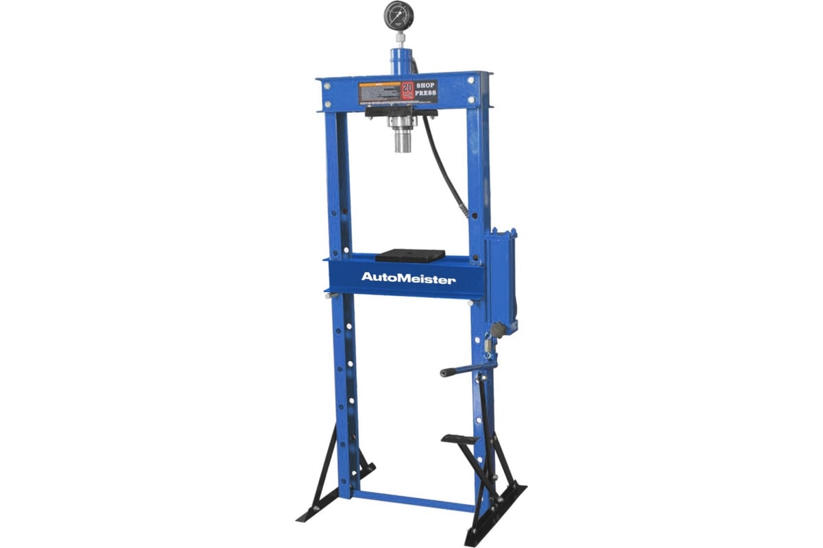 Пресс гидравлический AutoMeister 20т T0901F-1 - оборудование гаражное для автотранспортных средств и прицепов не военного назначения: пресс гидравлический профессиональный напольный с перемещаемым цилиндром вправо-влево, усилие 20 тонн, ручное и ножное управление силовой подачей штока цилиндра, ход цилиндра 135 мм, максимальная высота от рабочего стола до штока цилиндра 1100 мм, минимальная высота от рабочего стола до штока цилиндра 85 мм. Габариты: высота 1840 мм, ширина 675 мм, глубина 600 мм. В комплекте прессовая плита и манометр для определения усилия. Поставляется в разобранном состоянии.