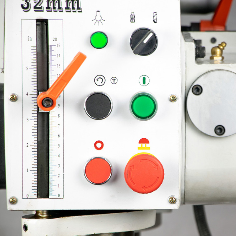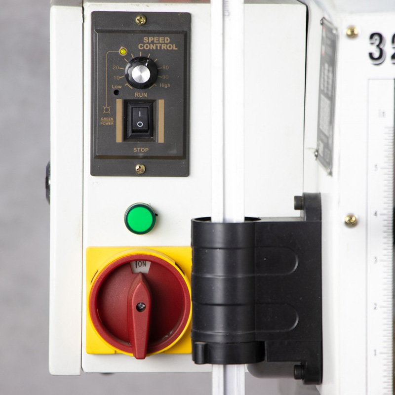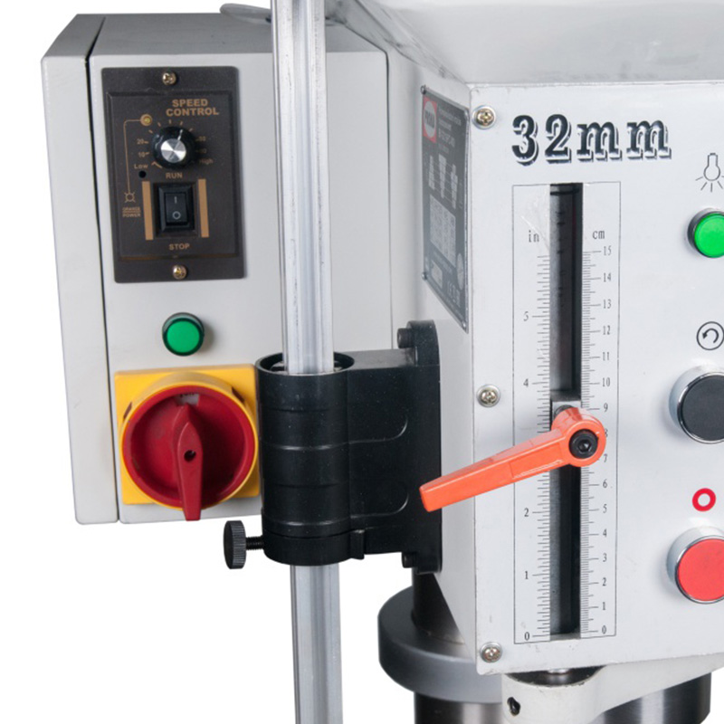 Станок обладает рядом особенностей. Отдельно стоить отметить регулируемую автоматическую вертикальную подачу пиноли при сверлении с автоматическим отключением на заданную глубину. 8 скоростной ременный привод с промежуточным шкивом для снижения шума при работе. Мощный асинхронный двигатель выдерживающий высокие нагрузки. Автореверс при нарезании резьбы, причём так же как автоподача – с настройкой заданной глубины.