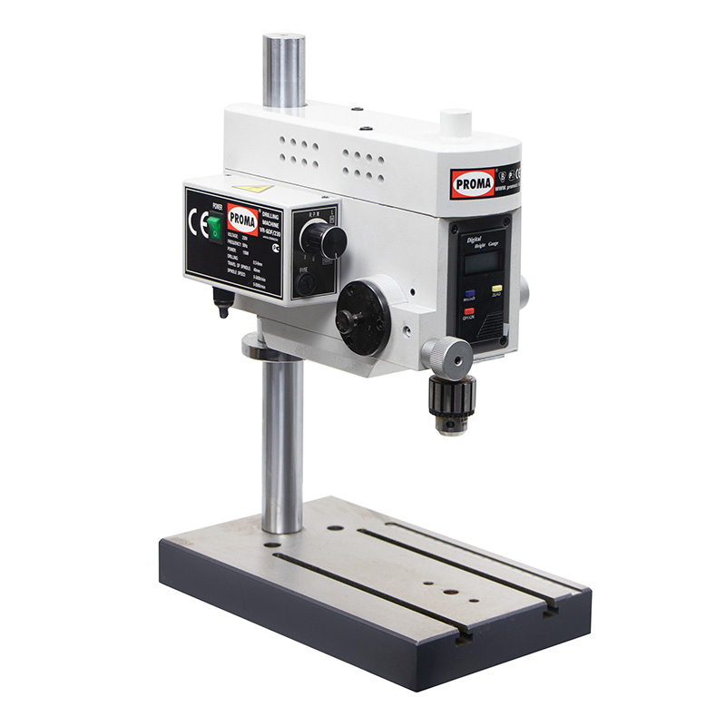 Из ряда особенностей следует отметить: высокоточную цифровую индикацию глубины сверления, плавную регулировку оборотов вращения шпинделя, тонкую вертикальную подачу и подключение питания к бытовой сети.