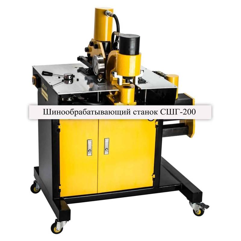 Станок шинообрабатывающий универсальный гидравлический СШГ-200 предназначен для резки, гибки и перфорации электротехнических шин толщиной до 10 мм и шириной до 200 мм. Шинообрабатывающий станок СШГ состоит из шиногиба, шинореза и шинодыра, закрепленных на передвижном столе. Внутри стола установлена маслостанция высокого давления, которая соединена с гидравлическим распределителем с помощью рукава высокого давления (РВД). Маслостанция оснащена электромагнитным клапаном сброса давления и управляется полностью педалью. Педаль имеет три положения: среднее положение - двигатель и магнит клапана сброса давления выключены, два крайних рабочих положения - включен либо двигатель, либо клапан сброса давления. Ручной распределитель имеет пять положений. Крайнее левое, крайнее правое и среднее - для работы с одним из трех инструментов, а два промежуточных положения - для сброса давления (для возврата штока). От распределителя идут три РВД с быстроразъемными соединениями (БРС) на конце, для подключения инструментов. На столе рядом с распределителем установлен манометр для контроля рабочего давления.