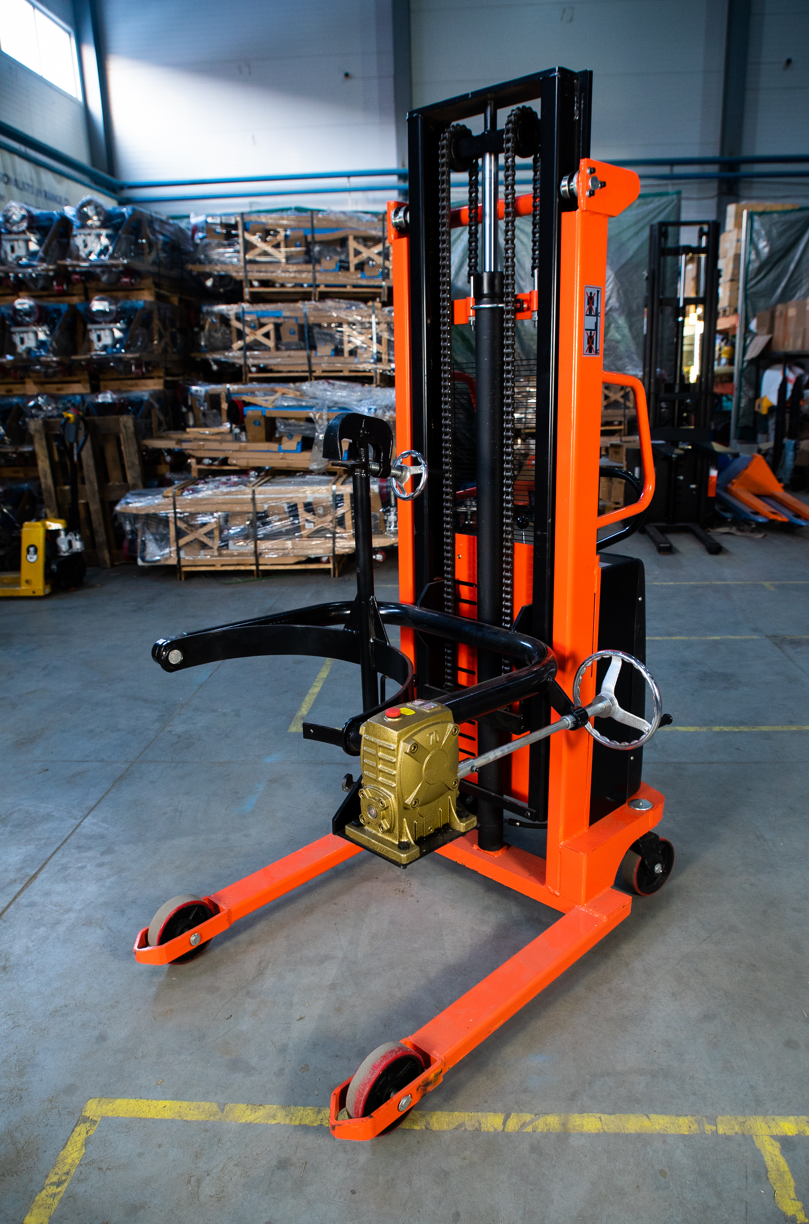 Оснащенный мощным электрогидравлическим приводом, штабелер обеспечивает плавный и контролируемый подъем груза на высоту до 2,5 метров. Его грузоподъемность составляет 350 кг, что идеально подходит для работы со стандартными промышленными бочками. Удобный электроподъем значительно снижает физическую нагрузку на оператора, повышая производительность и снижая риск травматизма. Прочная конструкция, включающая вилочный захват, гарантирует надежное удержание бочки в процессе транспортировки и кантования.