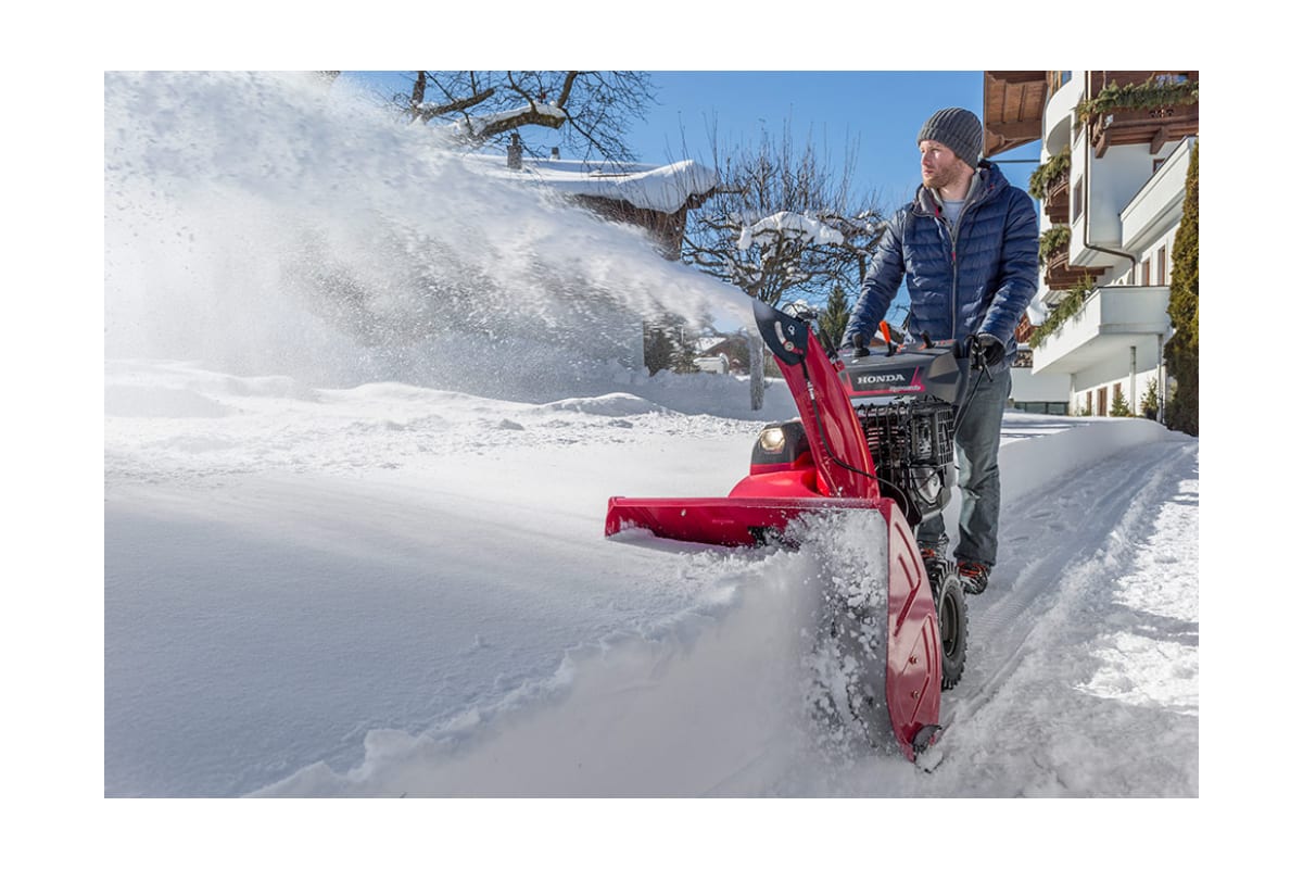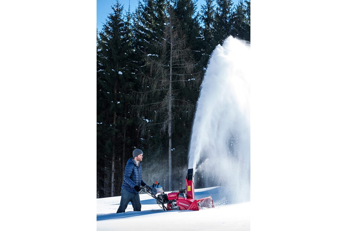 Бензиновый снегоотбрасыватель Honda HSS970A ETD за один проход очищает от снега полосу шириной 71 см. Боковые лыжи позволяют отрегулировать высоту положения ковша. Направление выброса снега регулируется при помощи механического привода. Максимальная дальность выброса составляет 16 м.