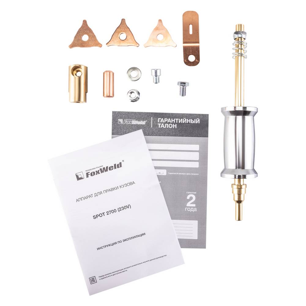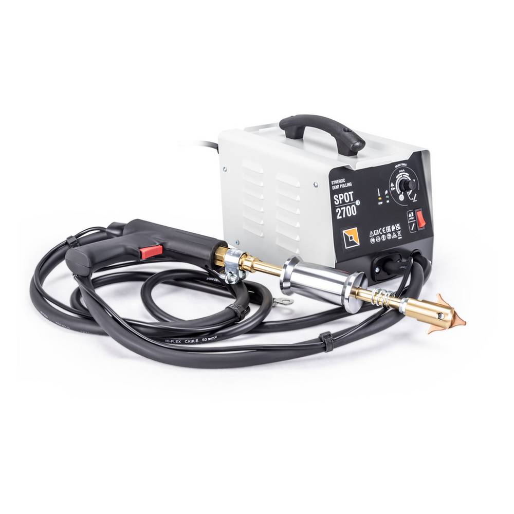 Споттер FoxWeld SPOT 2700 – аппарат для точечной контактной сварки, который применяется при восстановлении геометрии кузовных панелей автотранспортных средств, а также при ремонте стальных тонкостенных элементов. Данный аппарат предназначен для осуществления следующих кузовных работ: рихтование; сварка гвоздиков, заклёпок, кружков и шпилек для накладок; удаление выемок; выравнивание поверхности, устранение вмятин. Аппарат не предназначен для сборки металлических деталей. В качестве источника питания используется бытовая сеть переменного тока 230 В. Использование меди для обмотки силовой катушки трансформатора позволило увеличить силу тока сварки до 2600 А. Этот фактор в сочетании с сетевым предохранителем, увеличивает надежность агрегата.