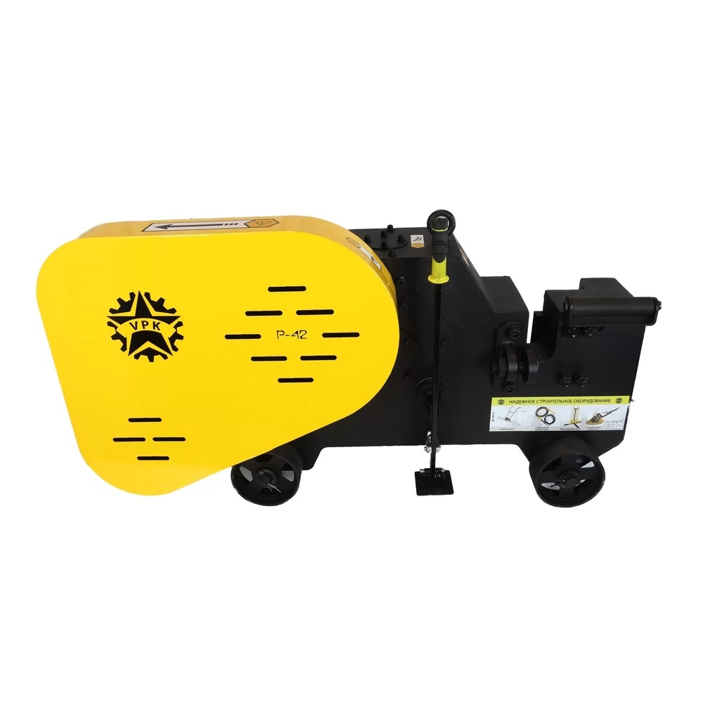 Станок для резки VPK Р-42 применяется при производстве железобетонных конструкций, нарезки прутков требуемой длины из арматурной и обычной углеродной стали, горячекатаных стальных прутков и стали с винтовой нарезкой. Оборудование торговой марки VPK показало себя с самой хорошей стороны даже в самых суровых условиях эксплуатации. Благодаря своей мобильности, высоким показателям производительности и надежности оно остается наиболее популярным в своем классе. Двигатель через маховик и редуктор передает вращение на коленчатый вал и шатун, таким образом реализуется возвратно-поступательное движение ножа, и соответственно, резка арматуры.
