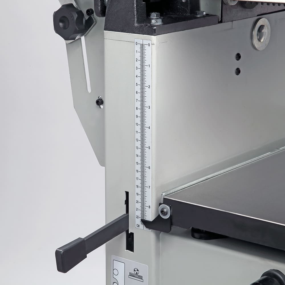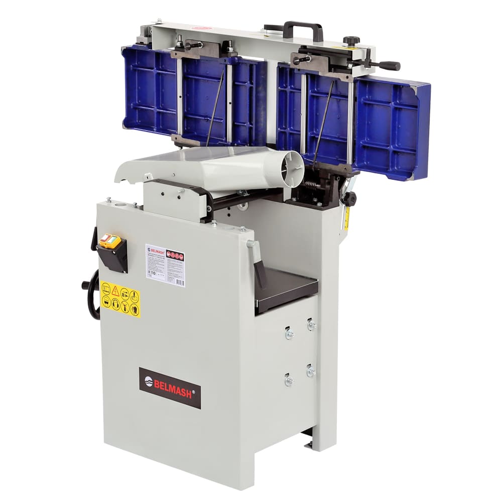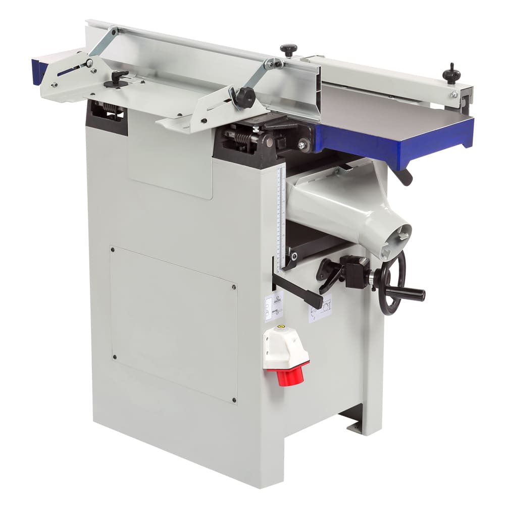 Станок предназначен для фугования и рейсмусования, данное оборудование идеально подходит и совмещает в себе все операции для калибровки доски. ширина обработки составляет 260 мм - это значение достаточно велико по меркам профессиональных рейсмусовых станков, а по меркам фуговальных - и вовсе характерно для оборудования более высокого индустриального класса. Мощность однофазного электродвигателя составляет 2200 Вт. Такое сочетание характеристик делает модель привлекательной не только с точки зрения экономии рабочего пространства, но и возможности выполнения серьезных задач. Конструкция станка – одна из самых удачных на рынке: широкое использование массивных чугунных деталей и большой вес гарантирует точную работу без вибраций. При рейсмусовании верхний модуль целиком поднимается и не мешает ни работе, ни стружкоудалению. Отдельного внимания заслуживает удобный эксцентриковый механизм регулировки положения столов, причем как подающего, так и принимающего. Входящий в базовое оснащение вал helical снабжен твердосплавными режущими вставками. Он надежнее и проще в эксплуатации (не нужно никаких регулировок), а за счет последовательного входа ножей в заготовку работает тише и с меньшими вибрациями. Частота вращения в 5500 об/мин. также способствует чистому резу. Для строгания по торцу или под углом от 90 до 45 градусов станок оборудован параллельным упором, который выполнен в жесткого алюминиевого профиля. При выборе между двумя специализированными или одним комбинированным станком нужно учитывать, что эта модель точна, удобна и производительна, как специализированные, но потребует несколько более частого обслуживания рейсмусовой части в случае интенсивной эксплуатации.