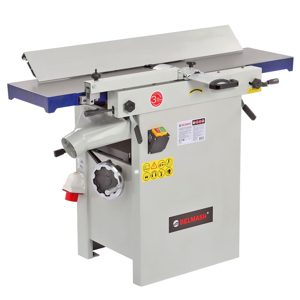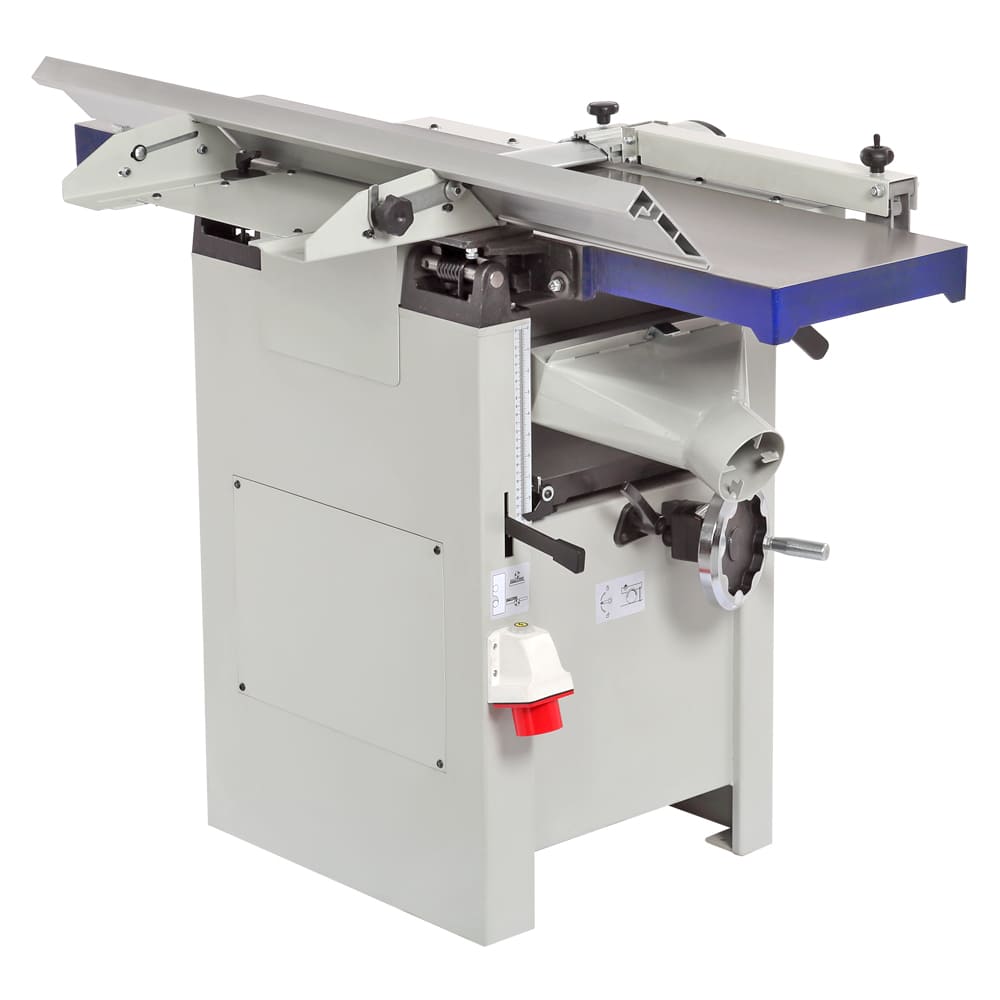 Станок предназначен для фугования и рейсмусования, данное оборудование идеально подходит и совмещает в себе все операции для калибровки доски. ширина обработки составляет 310 мм - это значение достаточно велико по меркам профессиональных рейсмусовых станков, а по меркам фуговальных - и вовсе характерно для оборудования более высокого индустриального класса. Мощность трехфазного электродвигателя составляет 3000 Вт. Такое сочетание характеристик делает модель привлекательной не только с точки зрения экономии рабочего пространства, но и возможности выполнения серьезных задач. Вилка (тип 515) для подключения к сети 400 (380) Вольт расположена на корпусе станка. Конструкция станка – одна из самых удачных на рынке: широкое использование массивных чугунных деталей и большой вес гарантирует точную работу без вибраций. При рейсмусовании верхний модуль целиком поднимается и не мешает ни работе, ни стружкоудалению. Отдельного внимания заслуживает удобный эксцентриковый механизм регулировки положения столов, причем как подающего, так и принимающего. Входящий в базовое оснащение стальной строгальный вал с тремя ножами прост в эксплуатации (имеет стандартные регулировки), а за счет частоты вращения в 5500 об/мин. обеспечивает чистый рез. Для строгания по торцу или под углом от 90 до 45 градусов станок оборудован параллельным упором, который выполнен в жесткого алюминиевого профиля. При выборе между двумя специализированными или одним комбинированным станком нужно учитывать, что эта модель точна, удобна и производительна, как специализированные, но потребует несколько более частого обслуживания рейсмусовой части в случае интенсивной эксплуатации.