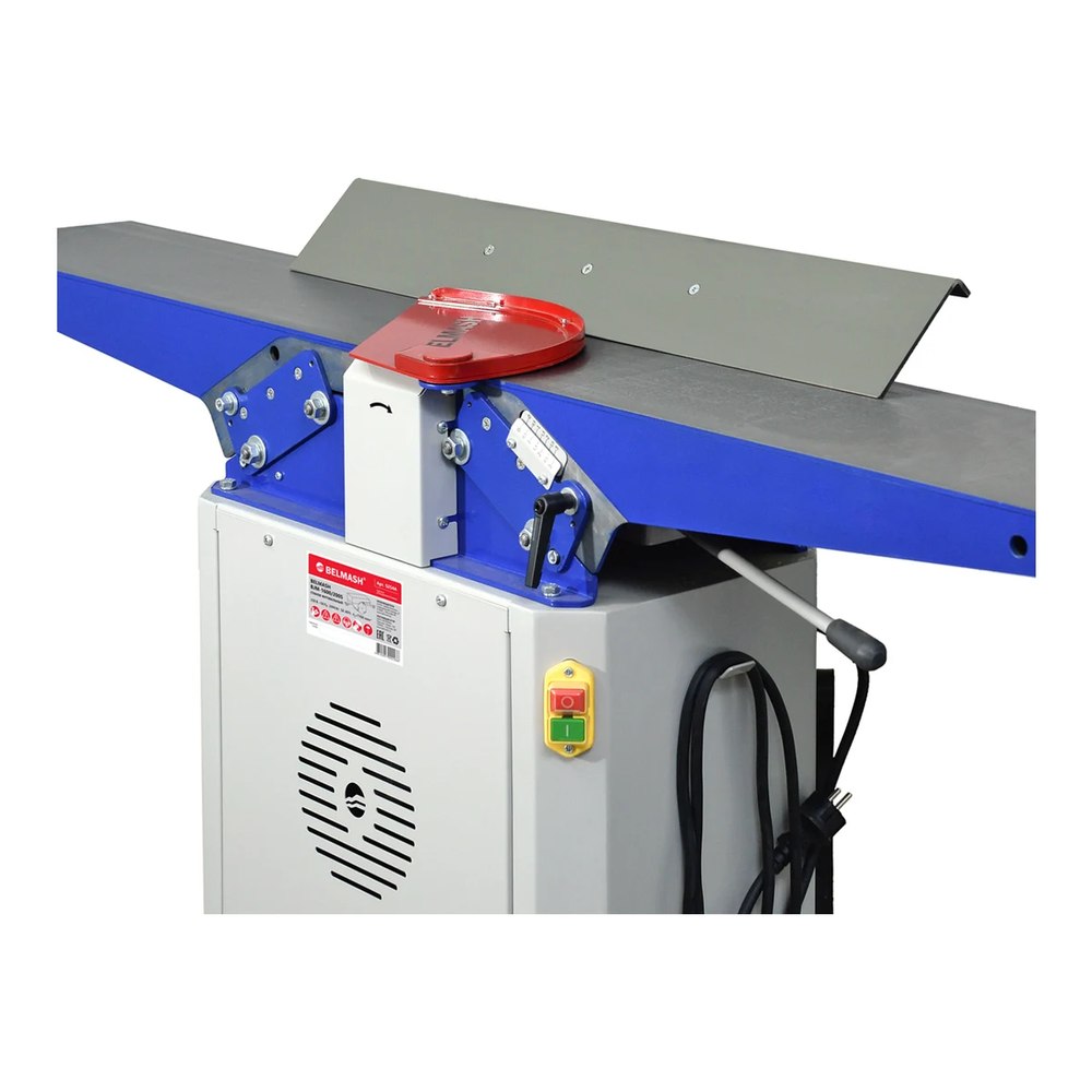 Станок фуговальный BELMASH BJM-1600/200S предназначен для обработки древесины с целью придания ей необходимых размеров и форм. При соответствующей наладке на станке можно выполнять следующие виды обработки: строгание (фугование) по пласти или кромкам, строгание (фугование) под углом (по ребрам). В качестве привода используется асинхронный электродвигатель. Вращение к ножевому валу передается с помощью поликлиноременной передачи. Натяжение ремня осуществляется автоматически под действием веса двигателя и тяговой пружины. Станок оснащен встроенным устройством отключения от источника питания при перегреве двигателя. Основная отличительная особенность данной модели - это диагональное расположение режущего узла. Такое нестандартное техническое решение позволяет избежать классического удара от прямо расположенного ножа по заготовке, равномерно распределив нагрузку. Для отвода отходов обработки установлен аспирационный патрубок диаметром 100 мм, к которому можно подключить вытяжную установку. Станок легко перемещать в пределах мастерской, т. к. имеется устройство перемещения и встроенные ролики. Для безопасной работы станок оборудован защитным кожухом ножевого вала, в комплекте есть толкатель.