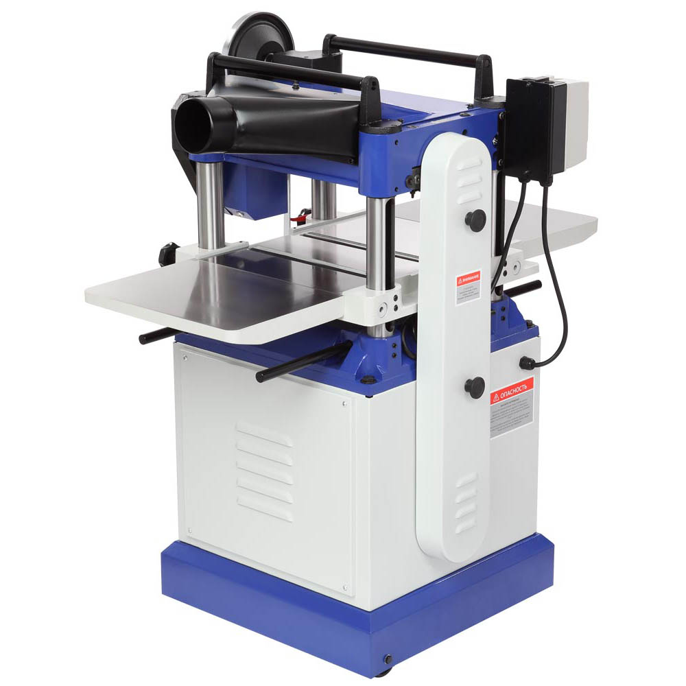 Станок предназначен для обработки древесины рейсмусованием с целью придания ей необходимых размеров. Основное преимущество – чугунные рабочий и два расширительных стола. Максимальный размер сечения обрабатываемого материала – 380×203 мм (Ш×В). Подача автоматическая, скоростей две – 5 и 9 м/мин. Процесс осуществляется двумя валами – подачи (зубчатым) и разгрузки (цельным). Два ролика рабочего стола облегчают перемещение заготовки. Регулировка высоты роликов зависит от типа обрабатываемого дерева. Диапазон настройки находится в пределах от 0 до 1,5 мм. В верхней части установлены два прокатных ролика для возврата заготовки. На данную модель установлен вал helical (сегментированный) с 75 ножевыми пластинами. Такая конструкция дает лучшее качество обработки, особенно при работе с твердыми породами дерева или при высокой загрузке оборудования. Имеется патрубок для отвода стружки, диаметр 100 мм. К нижней части корпуса крепится устройство для перемещения станка. Данная опция очень удобна и актуальна, т. к. несмотря на массу изделия в 270 кг перемещать станок по мастерской сможет один человек и без серьезных усилий.